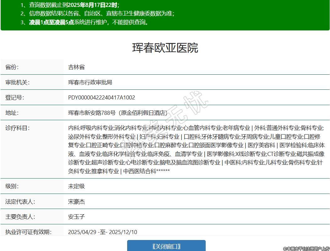 省份:吉林省审批机关:珲春市行政审批局登记号:PDY00000422240417A1002地址:珲春市新安路788号(原金佰利假日酒店)诊疗科目:内科;呼吸内科专业;消化内科专业;神经内科专业;心血管内科专业;老年病专业 | 外科;普通外科专业;骨科专业;泌尿外科专业;整形外科专业 | 妇产科;妇科专业 | 口腔科;牙体牙髓病专业;牙周病专业;儿童口腔专业;口腔修复专业;口腔正畸专业;口腔种植专业;口腔麻醉专业;口腔颌面医学影像专业 | 医疗美容科 | 医学检验科;临床体液、血液专业;临床化学检验专业;临床免疫、血清学专业 | 医学影像科;X线诊断专业;CT诊断专业;磁共振成像诊断专业;超声诊断专业;心电诊断专业;脑电及脑血流图诊断专业 | 中医科;内科专业;儿科专业;骨伤科专业;针灸科专业;推拿科专业 | 中西医结合科******级别:未定级法定代表人:宋豪杰主要负责人:安玉子执业许可证有效期:2025/04/29 -至- 2025/12/10 -