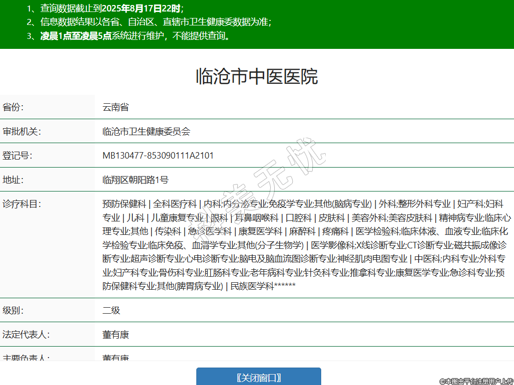 省份:云南省审批机关:临沧市卫生健康委员会登记号:MB130477-853090111A2101地址:临翔区朝阳路1号诊疗科目:预防保健科 | 全科医疗科 | 内科;内分泌专业;免疫学专业;其他(脑病专业) | 外科;整形外科专业 | 妇产科;妇科专业 | 儿科 | 儿童康复专业 | 眼科 | 耳鼻咽喉科 | 口腔科 | 皮肤科 | 美容外科;美容皮肤科 | 精神病专业;临床心理专业;其他 | 传染科 | 急诊医学科 | 康复医学科 | 麻醉科 | 疼痛科 | 医学检验科;临床体液、血液专业;临床化学检验专业;临床免疫、血清学专业;其他(分子生物学) | 医学影像科;X线诊断专业;CT诊断专业;磁共振成像诊断专业;超声诊断专业;心电诊断专业;脑电及脑血流图诊断专业;神经肌肉电图专业 | 中医科;内科专业;外科专业;妇产科专业;骨伤科专业;肛肠科专业;老年病科专业;针灸科专业;推拿科专业;康复医学专业;急诊科专业;预防保健科专业;其他(脾胃病专业) | 民族医学科******级别:二级法定代表人:董有康主要负责人:董有康执业许可证有效期:2025/06/09 -至- 2034/09/12 -