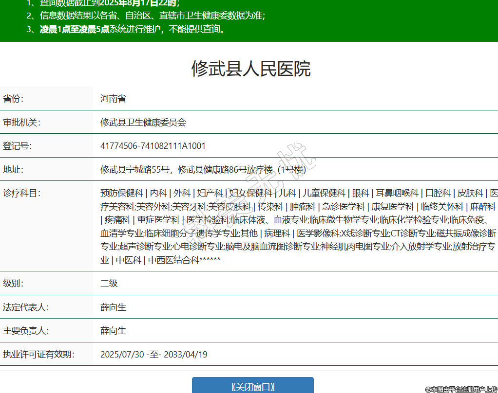 省份:河南省审批机关:修武县卫生健康委员会登记号:41774506-741082111A1001地址:修武县宁城路55号,修武县健康路86号放疗楼(1号楼)诊疗科目:预防保健科 | 内科 | 外科 | 妇产科 | 妇女保健科 | 儿科 | 儿童保健科 | 眼科 | 耳鼻咽喉科 | 口腔科 | 皮肤科 | 医疗美容科;美容外科;美容牙科;美容皮肤科 | 传染科 | 肿瘤科 | 急诊医学科 | 康复医学科 | 临终关怀科 | 麻醉科 | 疼痛科 | 重症医学科 | 医学检验科;临床体液、血液专业;临床微生物学专业;临床化学检验专业;临床免疫、血清学专业;临床细胞分子遗传学专业;其他 | 病理科 | 医学影像科;X线诊断专业;CT诊断专业;磁共振成像诊断专业;超声诊断专业;心电诊断专业;脑电及脑血流图诊断专业;神经肌肉电图专业;介入放射学专业;放射治疗专业 | 中医科 | 中西医结合科******级别:二级法定代表人:薛向生主要负责人:薛向生执业许可证有效期:2025/07/30 -至- 2033/04/19 -