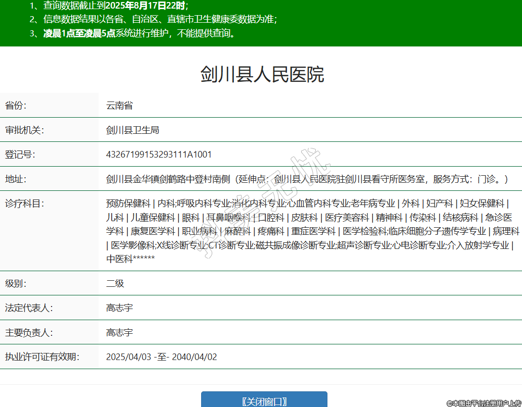 省份:云南省审批机关:剑川县卫生局登记号:43267199153293111A1001地址:剑川县金华镇剑鹤路中登村南侧(延伸点:剑川县人民医院驻剑川县看守所医务室,服务方式:门诊。)诊疗科目:预防保健科 | 内科;呼吸内科专业;消化内科专业;心血管内科专业;老年病专业 | 外科 | 妇产科 | 妇女保健科 | 儿科 | 儿童保健科 | 眼科 | 耳鼻咽喉科 | 口腔科 | 皮肤科 | 医疗美容科 | 精神科 | 传染科 | 结核病科 | 急诊医学科 | 康复医学科 | 职业病科 | 麻醉科 | 疼痛科 | 重症医学科 | 医学检验科;临床细胞分子遗传学专业 | 病理科 | 医学影像科;X线诊断专业;CT诊断专业;磁共振成像诊断专业;超声诊断专业;心电诊断专业;介入放射学专业 | 中医科******级别:二级法定代表人:高志宇主要负责人:高志宇执业许可证有效期:2025/04/03 -至- 2040/04/02 -