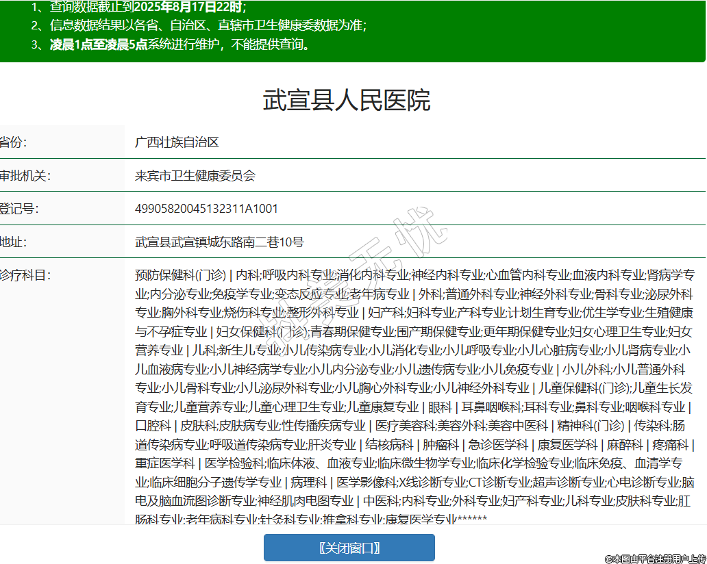 省份:广西壮族自治区审批机关:来宾市卫生健康委员会登记号:49905820045132311A1001地址:武宣县武宣镇城东路南二巷10号诊疗科目:预防保健科(门诊) | 内科;呼吸内科专业;消化内科专业;神经内科专业;心血管内科专业;血液内科专业;肾病学专业;内分泌专业;免疫学专业;变态反应专业;老年病专业 | 外科;普通外科专业;神经外科专业;骨科专业;泌尿外科专业;胸外科专业;烧伤科专业;整形外科专业 | 妇产科;妇科专业;产科专业;计划生育专业;优生学专业;生殖健康与不孕症专业 | 妇女保健科(门诊);青春期保健专业;围产期保健专业;更年期保健专业;妇女心理卫生专业;妇女营养专业 | 儿科;新生儿专业;小儿传染病专业;小儿消化专业;小儿呼吸专业;小儿心脏病专业;小儿肾病专业;小儿血液病专业;小儿神经病学专业;小儿内分泌专业;小儿遗传病专业;小儿免疫专业 | 小儿外科;小儿普通外科专业;小儿骨科专业;小儿泌尿外科专业;小儿胸心外科专业;小儿神经外科专业 | 儿童保健科(门诊);儿童生长发育专业;儿童营养专业;儿童心理卫生专业;儿童康复专业 | 眼科 | 耳鼻咽喉科;耳科专业;鼻科专业;咽喉科专业 | 口腔科 | 皮肤科;皮肤病专业;性传播疾病专业 | 医疗美容科;美容外科;美容中医科 | 精神科(门诊) | 传染科;肠道传染病专业;呼吸道传染病专业;肝炎专业 | 结核病科 | 肿瘤科 | 急诊医学科 | 康复医学科 | 麻醉科 | 疼痛科 | 重症医学科 | 医学检验科;临床体液、血液专业;临床微生物学专业;临床化学检验专业;临床免疫、血清学专业;临床细胞分子遗传学专业 | 病理科 | 医学影像科;X线诊断专业;CT诊断专业;超声诊断专业;心电诊断专业;脑电及脑血流图诊断专业;神经肌肉电图专业 | 中医科;内科专业;外科专业;妇产科专业;儿科专业;皮肤科专业;肛肠科专业;老年病科专业;针灸科专业;推拿科专业;康复医学专业******级别:二级法定代表人:庾佳南主要负责人:庾佳南执业许可证有效期:2019/03/02 -至- 2034/03/01 -