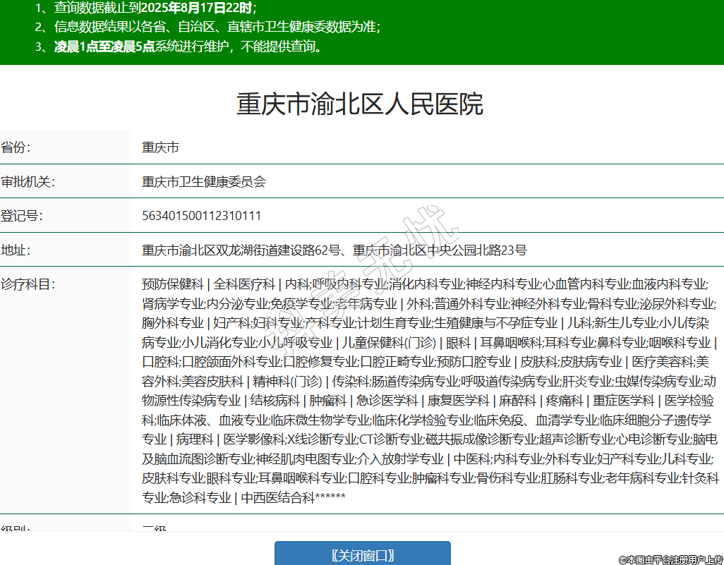 省份:重庆市审批机关:重庆市卫生健康委员会登记号:563401500112310111地址:重庆市渝北区双龙湖街道建设路62号、重庆市渝北区中央公园北路23号诊疗科目:预防保健科 | 全科医疗科 | 内科;呼吸内科专业;消化内科专业;神经内科专业;心血管内科专业;血液内科专业;肾病学专业;内分泌专业;免疫学专业;老年病专业 | 外科;普通外科专业;神经外科专业;骨科专业;泌尿外科专业;胸外科专业 | 妇产科;妇科专业;产科专业;计划生育专业;生殖健康与不孕症专业 | 儿科;新生儿专业;小儿传染病专业;小儿消化专业;小儿呼吸专业 | 儿童保健科(门诊) | 眼科 | 耳鼻咽喉科;耳科专业;鼻科专业;咽喉科专业 | 口腔科;口腔颌面外科专业;口腔修复专业;口腔正畸专业;预防口腔专业 | 皮肤科;皮肤病专业 | 医疗美容科;美容外科;美容皮肤科 | 精神科(门诊) | 传染科;肠道传染病专业;呼吸道传染病专业;肝炎专业;虫媒传染病专业;动物源性传染病专业 | 结核病科 | 肿瘤科 | 急诊医学科 | 康复医学科 | 麻醉科 | 疼痛科 | 重症医学科 | 医学检验科;临床体液、血液专业;临床微生物学专业;临床化学检验专业;临床免疫、血清学专业;临床细胞分子遗传学专业 | 病理科 | 医学影像科;X线诊断专业;CT诊断专业;磁共振成像诊断专业;超声诊断专业;心电诊断专业;脑电及脑血流图诊断专业;神经肌肉电图专业;介入放射学专业 | 中医科;内科专业;外科专业;妇产科专业;儿科专业;皮肤科专业;眼科专业;耳鼻咽喉科专业;口腔科专业;肿瘤科专业;骨伤科专业;肛肠科专业;老年病科专业;针灸科专业;急诊科专业 | 中西医结合科******级别:三级法定代表人:邓玉海主要负责人:执业许可证有效期:2019/05/21 -至- 2031/05/31 -