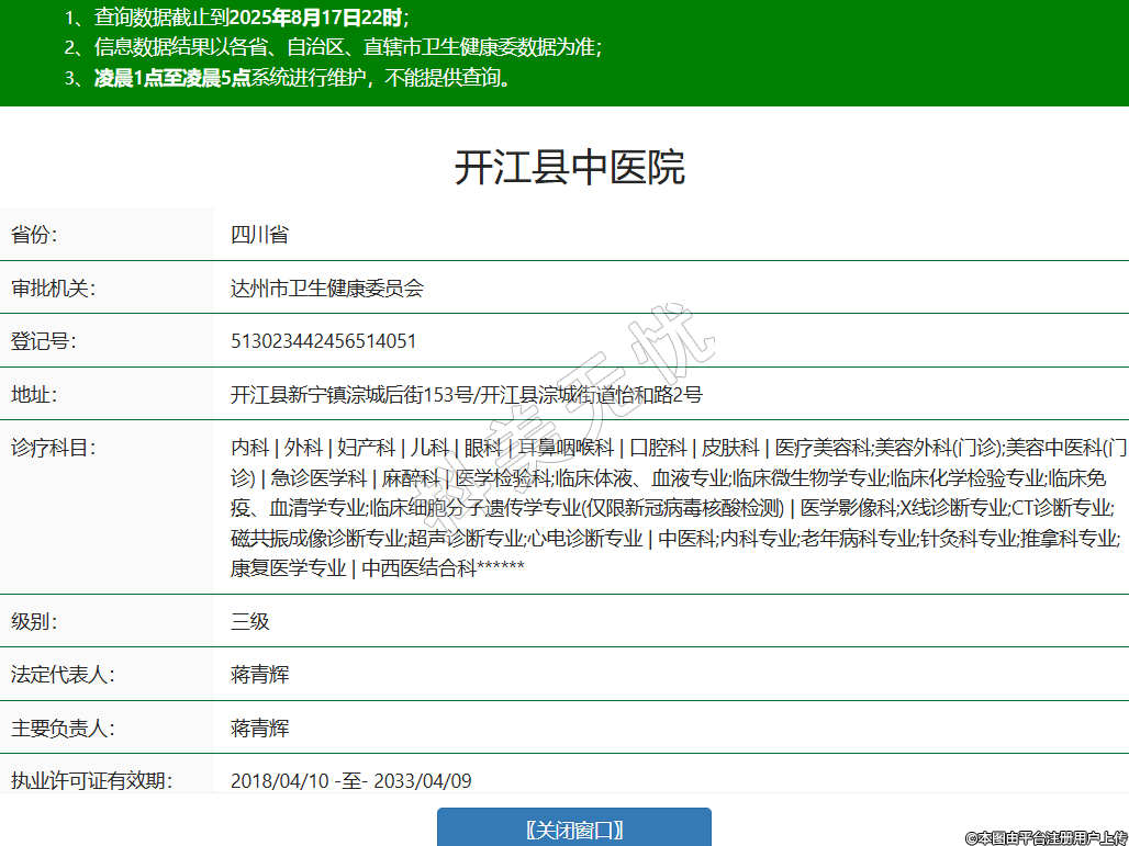 省份:四川省审批机关:达州市卫生健康委员会登记号:513023442456514051地址:开江县新宁镇淙城后街153号/开江县淙城街道怡和路2号诊疗科目:内科 | 外科 | 妇产科 | 儿科 | 眼科 | 耳鼻咽喉科 | 口腔科 | 皮肤科 | 医疗美容科;美容外科(门诊);美容中医科(门诊) | 急诊医学科 | 麻醉科 | 医学检验科;临床体液、血液专业;临床微生物学专业;临床化学检验专业;临床免疫、血清学专业;临床细胞分子遗传学专业(仅限新冠病毒核酸检测) | 医学影像科;X线诊断专业;CT诊断专业;磁共振成像诊断专业;超声诊断专业;心电诊断专业 | 中医科;内科专业;老年病科专业;针灸科专业;推拿科专业;康复医学专业 | 中西医结合科******级别:三级法定代表人:蒋青辉主要负责人:蒋青辉执业许可证有效期:2018/04/10 -至- 2033/04/09 -