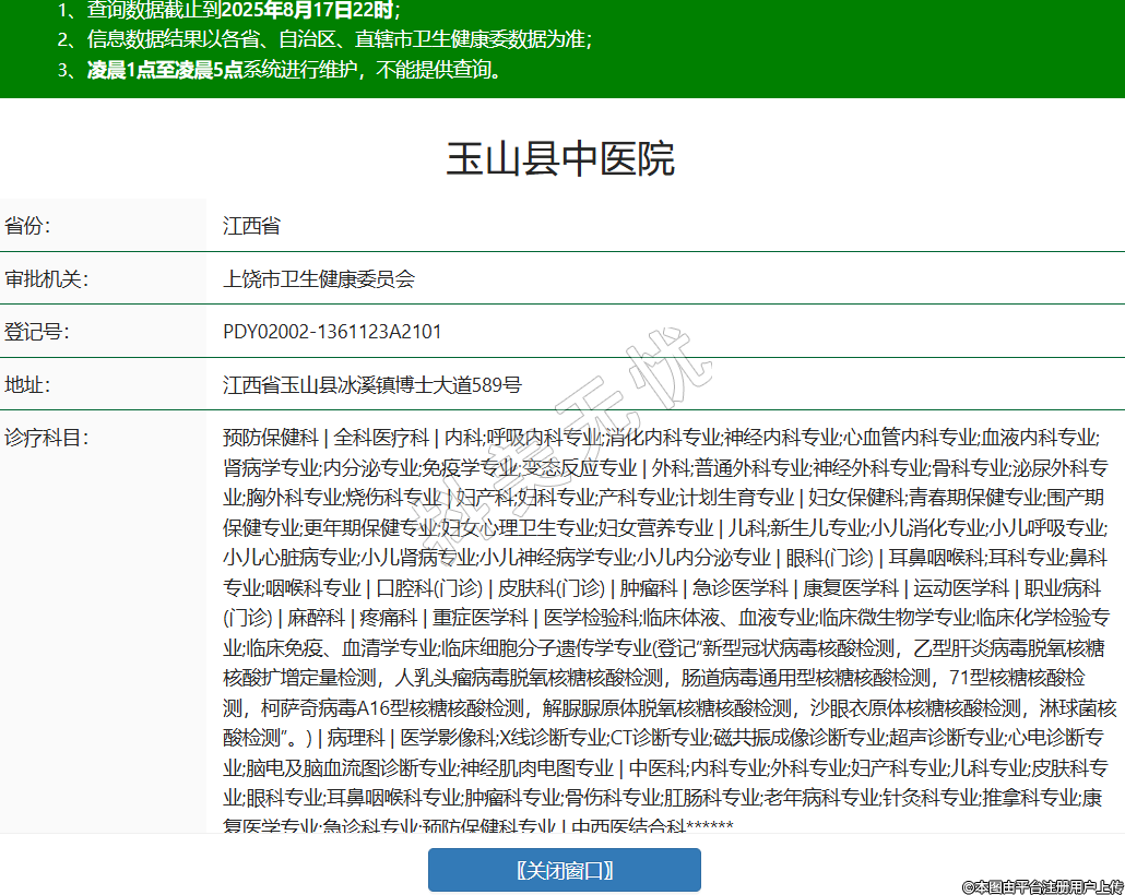 省份:江西省审批机关:上饶市卫生健康委员会登记号:PDY02002-1361123A2101地址:江西省玉山县冰溪镇博士大道589号诊疗科目:预防保健科 | 全科医疗科 | 内科;呼吸内科专业;消化内科专业;神经内科专业;心血管内科专业;血液内科专业;肾病学专业;内分泌专业;免疫学专业;变态反应专业 | 外科;普通外科专业;神经外科专业;骨科专业;泌尿外科专业;胸外科专业;烧伤科专业 | 妇产科;妇科专业;产科专业;计划生育专业 | 妇女保健科;青春期保健专业;围产期保健专业;更年期保健专业;妇女心理卫生专业;妇女营养专业 | 儿科;新生儿专业;小儿消化专业;小儿呼吸专业;小儿心脏病专业;小儿肾病专业;小儿神经病学专业;小儿内分泌专业 | 眼科(门诊) | 耳鼻咽喉科;耳科专业;鼻科专业;咽喉科专业 | 口腔科(门诊) | 皮肤科(门诊) | 肿瘤科 | 急诊医学科 | 康复医学科 | 运动医学科 | 职业病科(门诊) | 麻醉科 | 疼痛科 | 重症医学科 | 医学检验科;临床体液、血液专业;临床微生物学专业;临床化学检验专业;临床免疫、血清学专业;临床细胞分子遗传学专业(登记“新型冠状病毒核酸检测,乙型肝炎病毒脱氧核糖核酸扩增定量检测,人乳头瘤病毒脱氧核糖核酸检测,肠道病毒通用型核糖核酸检测,71型核糖核酸检测,柯萨奇病毒A16型核糖核酸检测,解脲脲原体脱氧核糖核酸检测,沙眼衣原体核糖核酸检测,淋球菌核酸检测”。) | 病理科 | 医学影像科;X线诊断专业;CT诊断专业;磁共振成像诊断专业;超声诊断专业;心电诊断专业;脑电及脑血流图诊断专业;神经肌肉电图专业 | 中医科;内科专业;外科专业;妇产科专业;儿科专业;皮肤科专业;眼科专业;耳鼻咽喉科专业;肿瘤科专业;骨伤科专业;肛肠科专业;老年病科专业;针灸科专业;推拿科专业;康复医学专业;急诊科专业;预防保健科专业 | 中西医结合科******级别:三级法定代表人:顾晓军主要负责人:郑防军执业许可证有效期:2021/02/24 -至- 2036/02/23 -