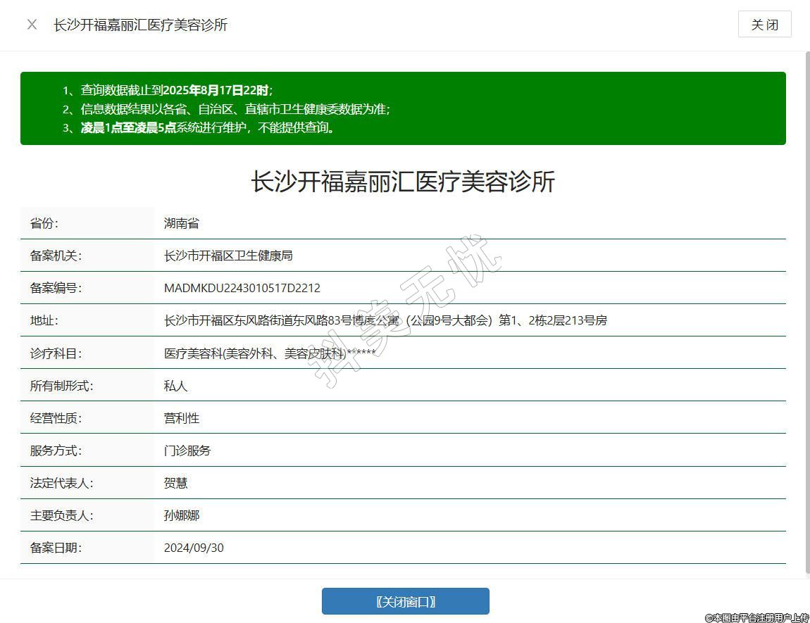 长沙嘉丽汇医疗美容诊所成立于2024年,位于湖南省长沙市开福区东风路街道东风路83号博度公寓(公园9号大都会)第1、2栋2层213号房,由专业医美团队打造,具备完善医疗环境与专业医疗技术,开展项目丰富,涵盖美容外科、激光美肤、微整抗衰等项目,始终秉持科学、严谨态度对待每位顾客。