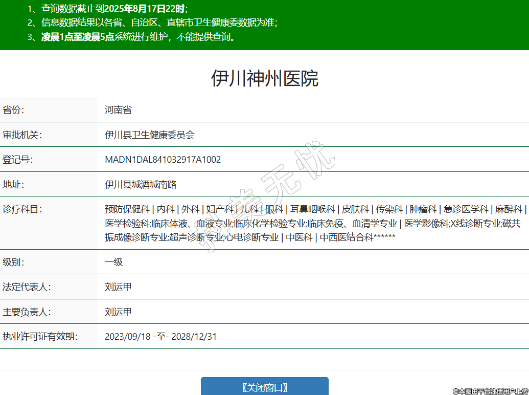 省份:河南省审批机关:伊川县卫生健康委员会登记号:MADN1DAL841032917A1002地址:伊川县城酒城南路诊疗科目:预防保健科 | 内科 | 外科 | 妇产科 | 儿科 | 眼科 | 耳鼻咽喉科 | 皮肤科 | 传染科 | 肿瘤科 | 急诊医学科 | 麻醉科 | 医学检验科;临床体液、血液专业;临床化学检验专业;临床免疫、血清学专业 | 医学影像科;X线诊断专业;磁共振成像诊断专业;超声诊断专业;心电诊断专业 | 中医科 | 中西医结合科******级别:一级法定代表人:刘运甲主要负责人:刘运甲执业许可证有效期:2023/09/18 -至- 2028/12/31 -