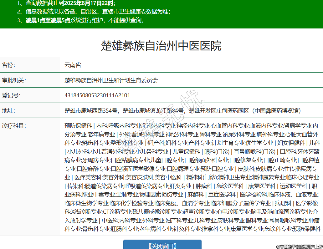 省份:云南省审批机关:楚雄彝族自治州卫生和计划生育委员会登记号:43184508053230111A2101地址:楚雄市鹿城西路354号,楚雄市鹿城镇龙江路84号,楚雄开发区庄甸医药园区(中国彝医药博览馆)诊疗科目:预防保健科 | 内科;呼吸内科专业;消化内科专业;神经内科专业;心血管内科专业;血液内科专业;肾病学专业;内分泌专业;老年病专业 | 外科;普通外科专业;神经外科专业;骨科专业;泌尿外科专业;胸外科专业;心脏大血管外科专业;烧伤科专业;整形外科专业 | 妇产科;妇科专业;产科专业;计划生育专业;优生学专业 | 妇女保健科 | 儿科 | 小儿外科;小儿普通外科专业;小儿骨科专业 | 儿童保健科 | 眼科(门诊) | 耳鼻咽喉科(门诊) | 口腔科;牙体牙髓病专业;牙周病专业;口腔粘膜病专业;儿童口腔专业;口腔颌面外科专业;口腔修复专业;口腔正畸专业;口腔种植专业;口腔麻醉专业;口腔颌面医学影像专业;口腔病理专业;预防口腔专业 | 皮肤科;皮肤病专业;性传播疾病专业 | 医疗美容科;美容外科;美容皮肤科;美容中医科 | 精神科(门诊);精神卫生专业;精神康复专业;临床心理专业 | 传染科;肠道传染病专业;呼吸道传染病专业;肝炎专业 | 肿瘤科 | 急诊医学科 | 康复医学科 | 运动医学科 | 职业病科;职业中毒专业;尘肺专业;物理因素损伤专业 | 麻醉科 | 重症医学科 | 医学检验科;临床体液、血液专业;临床微生物学专业;临床化学检验专业;临床免疫、血清学专业;临床细胞分子遗传学专业 | 病理科 | 医学影像科;X线诊断专业;CT诊断专业;磁共振成像诊断专业;超声诊断专业;心电诊断专业;脑电及脑血流图诊断专业;介入放射学专业 | 中医科;内科专业;外科专业;妇产科专业;儿科专业;皮肤科专业;眼科专业;耳鼻咽喉科专业;肿瘤科专业;骨伤科专业;肛肠科专业;老年病科专业;针灸科专业;推拿科专业;康复医学专业;急诊科专业;预防保健科专业;其他(风湿病科) | 民族医学科;彝医学 | 中西医结合科******级别:三级法定代表人:代必洪主要负责人:代必洪执业许可证有效期:2025/08/05 -至- 2040/08/04 -
