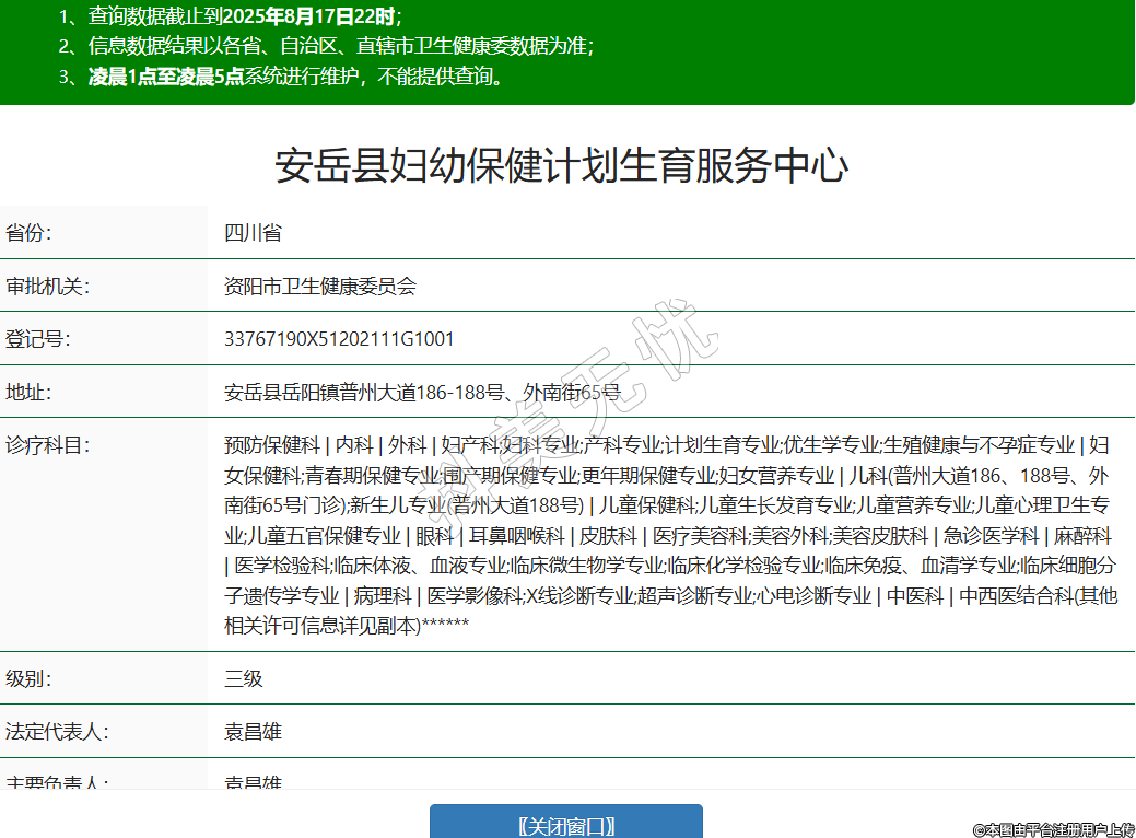 省份:四川省审批机关:资阳市卫生健康委员会登记号:33767190X51202111G1001地址:安岳县岳阳镇普州大道186-188号、外南街65号诊疗科目:预防保健科 | 内科 | 外科 | 妇产科;妇科专业;产科专业;计划生育专业;优生学专业;生殖健康与不孕症专业 | 妇女保健科;青春期保健专业;围产期保健专业;更年期保健专业;妇女营养专业 | 儿科(普州大道186、188号、外南街65号门诊);新生儿专业(普州大道188号) | 儿童保健科;儿童生长发育专业;儿童营养专业;儿童心理卫生专业;儿童五官保健专业 | 眼科 | 耳鼻咽喉科 | 皮肤科 | 医疗美容科;美容外科;美容皮肤科 | 急诊医学科 | 麻醉科 | 医学检验科;临床体液、血液专业;临床微生物学专业;临床化学检验专业;临床免疫、血清学专业;临床细胞分子遗传学专业 | 病理科 | 医学影像科;X线诊断专业;超声诊断专业;心电诊断专业 | 中医科 | 中西医结合科(其他相关许可信息详见副本)******级别:三级法定代表人:袁昌雄主要负责人:袁昌雄执业许可证有效期:2011/07/27 -至- 2026/08/01 -