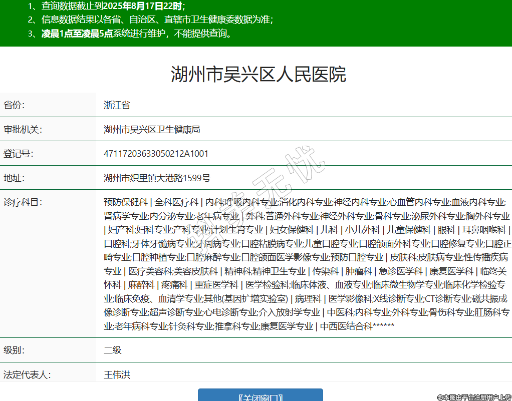 省份:浙江省审批机关:湖州市吴兴区卫生健康局登记号:47117203633050212A1001地址:湖州市织里镇大港路1599号诊疗科目:预防保健科 | 全科医疗科 | 内科;呼吸内科专业;消化内科专业;神经内科专业;心血管内科专业;血液内科专业;肾病学专业;内分泌专业;老年病专业 | 外科;普通外科专业;神经外科专业;骨科专业;泌尿外科专业;胸外科专业 | 妇产科;妇科专业;产科专业;计划生育专业 | 妇女保健科 | 儿科 | 小儿外科 | 儿童保健科 | 眼科 | 耳鼻咽喉科 | 口腔科;牙体牙髓病专业;牙周病专业;口腔粘膜病专业;儿童口腔专业;口腔颌面外科专业;口腔修复专业;口腔正畸专业;口腔种植专业;口腔麻醉专业;口腔颌面医学影像专业;预防口腔专业 | 皮肤科;皮肤病专业;性传播疾病专业 | 医疗美容科;美容皮肤科 | 精神科;精神卫生专业 | 传染科 | 肿瘤科 | 急诊医学科 | 康复医学科 | 临终关怀科 | 麻醉科 | 疼痛科 | 重症医学科 | 医学检验科;临床体液、血液专业;临床微生物学专业;临床化学检验专业;临床免疫、血清学专业;其他(基因扩增实验室) | 病理科 | 医学影像科;X线诊断专业;CT诊断专业;磁共振成像诊断专业;超声诊断专业;心电诊断专业;介入放射学专业 | 中医科;内科专业;外科专业;骨伤科专业;肛肠科专业;老年病科专业;针灸科专业;推拿科专业;康复医学专业 | 中西医结合科******级别:二级法定代表人:王伟洪主要负责人:武中庆执业许可证有效期:2021/07/13 -至- 2026/07/12 -