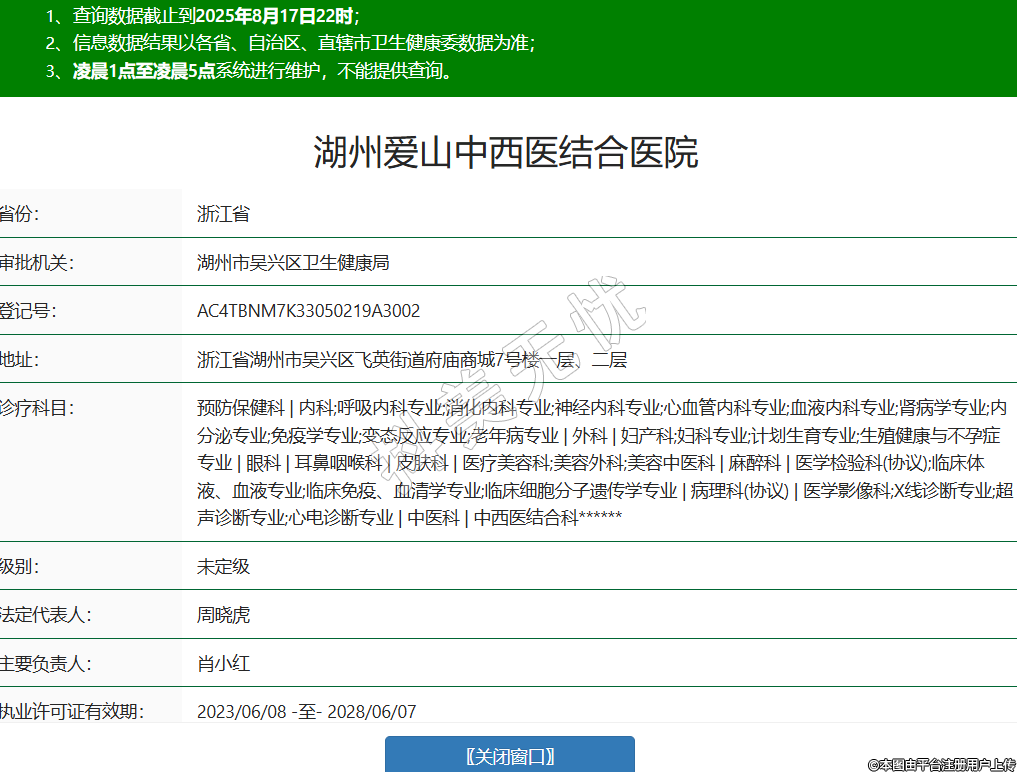 省份:浙江省审批机关:湖州市吴兴区卫生健康局登记号:AC4TBNM7K33050219A3002地址:浙江省湖州市吴兴区飞英街道府庙商城7号楼一层、二层诊疗科目:预防保健科 | 内科;呼吸内科专业;消化内科专业;神经内科专业;心血管内科专业;血液内科专业;肾病学专业;内分泌专业;免疫学专业;变态反应专业;老年病专业 | 外科 | 妇产科;妇科专业;计划生育专业;生殖健康与不孕症专业 | 眼科 | 耳鼻咽喉科 | 皮肤科 | 医疗美容科;美容外科;美容中医科 | 麻醉科 | 医学检验科(协议);临床体液、血液专业;临床免疫、血清学专业;临床细胞分子遗传学专业 | 病理科(协议) | 医学影像科;X线诊断专业;超声诊断专业;心电诊断专业 | 中医科 | 中西医结合科******级别:未定级法定代表人:周晓虎主要负责人:肖小红执业许可证有效期:2023/06/08 -至- 2028/06/07 -