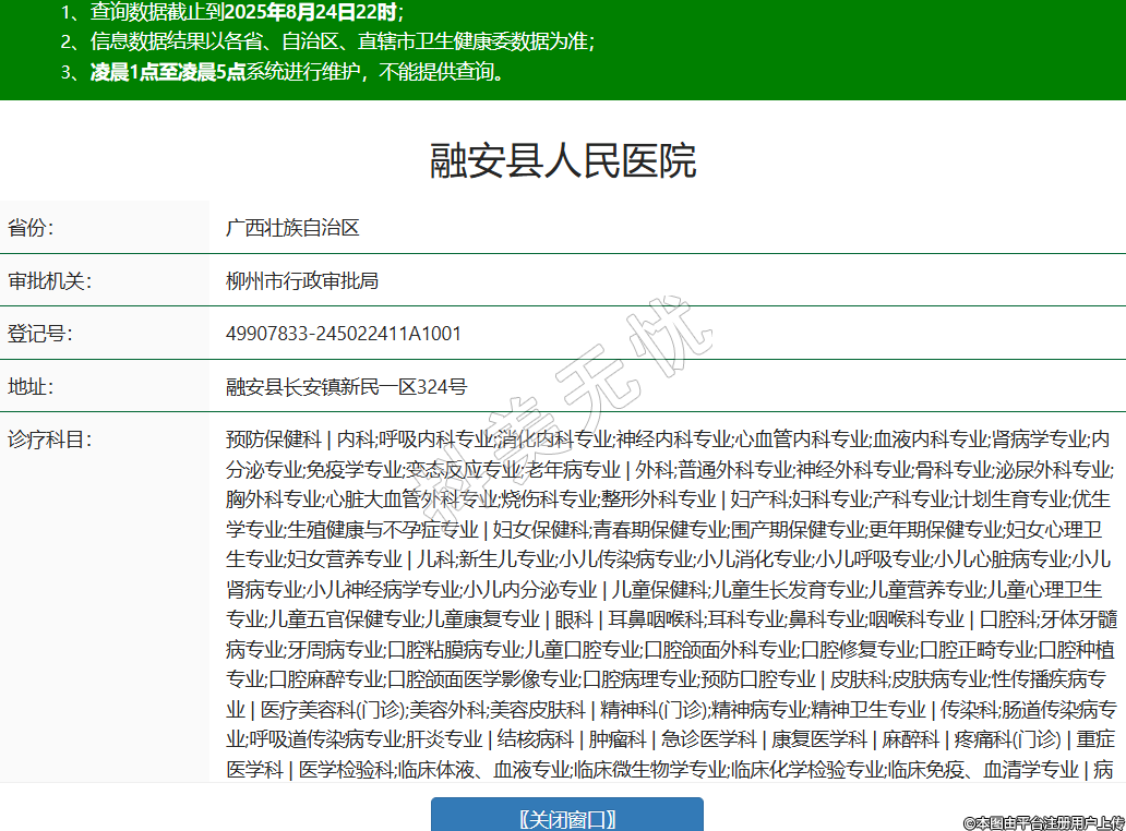 省份:广西壮族自治区审批机关:柳州市行政审批局登记号:49907833-245022411A1001地址:融安县长安镇新民一区324号诊疗科目:预防保健科 | 内科;呼吸内科专业;消化内科专业;神经内科专业;心血管内科专业;血液内科专业;肾病学专业;内分泌专业;免疫学专业;变态反应专业;老年病专业 | 外科;普通外科专业;神经外科专业;骨科专业;泌尿外科专业;胸外科专业;心脏大血管外科专业;烧伤科专业;整形外科专业 | 妇产科;妇科专业;产科专业;计划生育专业;优生学专业;生殖健康与不孕症专业 | 妇女保健科;青春期保健专业;围产期保健专业;更年期保健专业;妇女心理卫生专业;妇女营养专业 | 儿科;新生儿专业;小儿传染病专业;小儿消化专业;小儿呼吸专业;小儿心脏病专业;小儿肾病专业;小儿神经病学专业;小儿内分泌专业 | 儿童保健科;儿童生长发育专业;儿童营养专业;儿童心理卫生专业;儿童五官保健专业;儿童康复专业 | 眼科 | 耳鼻咽喉科;耳科专业;鼻科专业;咽喉科专业 | 口腔科;牙体牙髓病专业;牙周病专业;口腔粘膜病专业;儿童口腔专业;口腔颌面外科专业;口腔修复专业;口腔正畸专业;口腔种植专业;口腔麻醉专业;口腔颌面医学影像专业;口腔病理专业;预防口腔专业 | 皮肤科;皮肤病专业;性传播疾病专业 | 医疗美容科(门诊);美容外科;美容皮肤科 | 精神科(门诊);精神病专业;精神卫生专业 | 传染科;肠道传染病专业;呼吸道传染病专业;肝炎专业 | 结核病科 | 肿瘤科 | 急诊医学科 | 康复医学科 | 麻醉科 | 疼痛科(门诊) | 重症医学科 | 医学检验科;临床体液、血液专业;临床微生物学专业;临床化学检验专业;临床免疫、血清学专业 | 病理科 | 医学影像科;X线诊断专业;CT诊断专业;磁共振成像诊断专业;超声诊断专业;心电诊断专业;脑电及脑血流图诊断专业;介入放射学专业 | 中医科;内科专业;外科专业;妇产科专业;儿科专业;骨伤科专业;肛肠科专业;老年病科专业;针灸科专业;推拿科专业;康复医学专业 | 中西医结合科******级别:二级法定代表人:刘朝晖主要负责人:刘朝晖执业许可证有效期:2025/07/28 -至- 2033/07/31 -