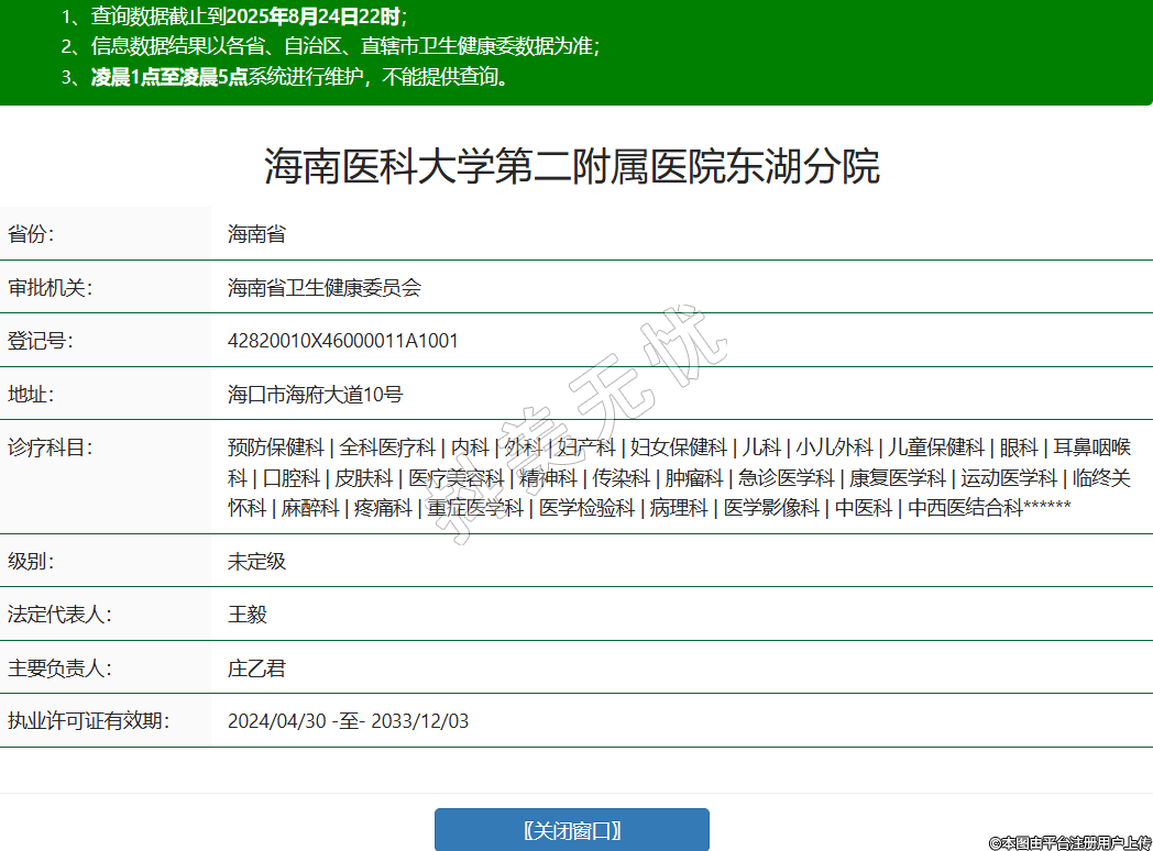 省份:海南省审批机关:海南省卫生健康委员会登记号:42820010X46000011A1001地址:海口市海府大道10号诊疗科目:预防保健科 | 全科医疗科 | 内科 | 外科 | 妇产科 | 妇女保健科 | 儿科 | 小儿外科 | 儿童保健科 | 眼科 | 耳鼻咽喉科 | 口腔科 | 皮肤科 | 医疗美容科 | 精神科 | 传染科 | 肿瘤科 | 急诊医学科 | 康复医学科 | 运动医学科 | 临终关怀科 | 麻醉科 | 疼痛科 | 重症医学科 | 医学检验科 | 病理科 | 医学影像科 | 中医科 | 中西医结合科******级别:未定级法定代表人:王毅主要负责人:庄乙君执业许可证有效期:2024/04/30 -至- 2033/12/03 -