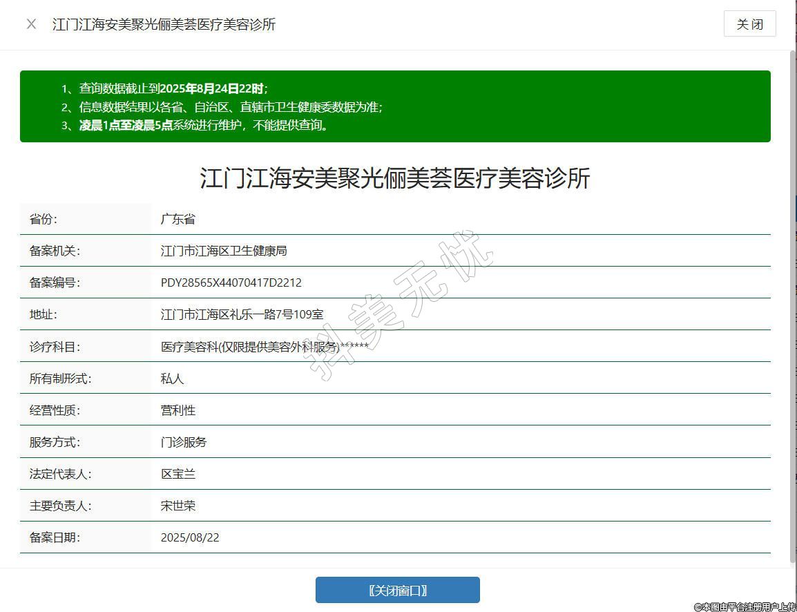江门安美聚光俪美荟医疗美容诊所成立于2024年,位于江门市江海区礼乐一路7号109室,汇聚了专业的医美团队,具备丰富临床经验与专业技艺,涵盖皮肤美容、微整形等多领域项目,秉持严谨态度,根据您的个人特点与需求,定制个性化医美服务。