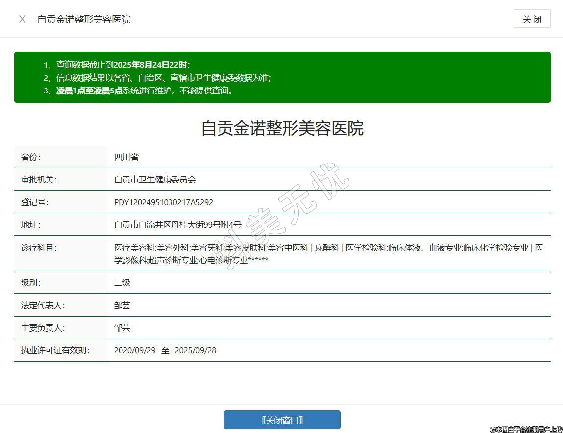 自贡金诺整形美容医院是经四川卫生计生委批准设立的医学美容医院,成立于2016年,位于自贡市自流井区丹桂大街99号附4号,秉持 “诚信专业,一诺千金” 的理念服务大众,配备完善医疗设施,设有整形美容外科、美容皮肤科等多个科室,涵盖鼻部整形、除皱美容、注射美容、牙齿整形等众多项目,为求美者提供全方位的医学美容服务。