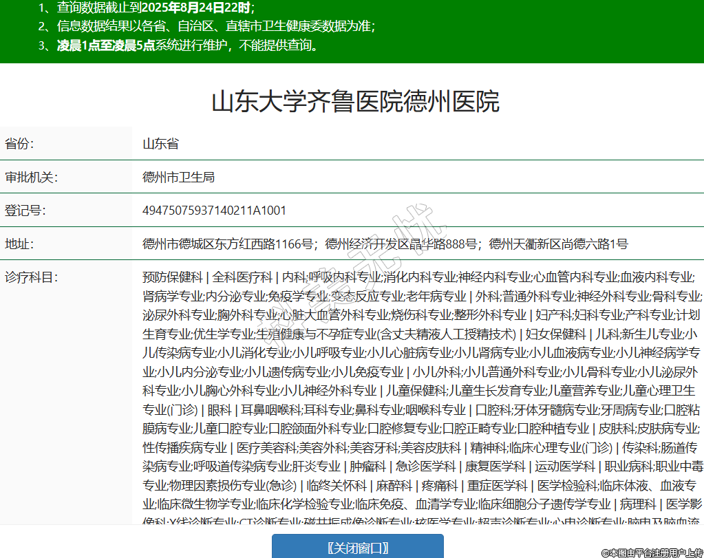 省份:山东省审批机关:德州市卫生局登记号:49475075937140211A1001地址:德州市德城区东方红西路1166号;德州经济开发区晶华路888号;德州天衢新区尚德六路1号诊疗科目:预防保健科 | 全科医疗科 | 内科;呼吸内科专业;消化内科专业;神经内科专业;心血管内科专业;血液内科专业;肾病学专业;内分泌专业;免疫学专业;变态反应专业;老年病专业 | 外科;普通外科专业;神经外科专业;骨科专业;泌尿外科专业;胸外科专业;心脏大血管外科专业;烧伤科专业;整形外科专业 | 妇产科;妇科专业;产科专业;计划生育专业;优生学专业;生殖健康与不孕症专业(含丈夫精液人工授精技术) | 妇女保健科 | 儿科;新生儿专业;小儿传染病专业;小儿消化专业;小儿呼吸专业;小儿心脏病专业;小儿肾病专业;小儿血液病专业;小儿神经病学专业;小儿内分泌专业;小儿遗传病专业;小儿免疫专业 | 小儿外科;小儿普通外科专业;小儿骨科专业;小儿泌尿外科专业;小儿胸心外科专业;小儿神经外科专业 | 儿童保健科;儿童生长发育专业;儿童营养专业;儿童心理卫生专业(门诊) | 眼科 | 耳鼻咽喉科;耳科专业;鼻科专业;咽喉科专业 | 口腔科;牙体牙髓病专业;牙周病专业;口腔粘膜病专业;儿童口腔专业;口腔颌面外科专业;口腔修复专业;口腔正畸专业;口腔种植专业 | 皮肤科;皮肤病专业;性传播疾病专业 | 医疗美容科;美容外科;美容牙科;美容皮肤科 | 精神科;临床心理专业(门诊) | 传染科;肠道传染病专业;呼吸道传染病专业;肝炎专业 | 肿瘤科 | 急诊医学科 | 康复医学科 | 运动医学科 | 职业病科;职业中毒专业;物理因素损伤专业(急诊) | 临终关怀科 | 麻醉科 | 疼痛科 | 重症医学科 | 医学检验科;临床体液、血液专业;临床微生物学专业;临床化学检验专业;临床免疫、血清学专业;临床细胞分子遗传学专业 | 病理科 | 医学影像科;X线诊断专业;CT诊断专业;磁共振成像诊断专业;核医学专业;超声诊断专业;心电诊断专业;脑电及脑血流图诊断专业;神经肌肉电图专业;介入放射学专业;放射治疗专业 | 中医科;内科专业;肿瘤科专业;骨伤科专业;肛肠科专业;老年病科专业;针灸科专业;推拿科专业;康复医学专业 | 中西医结合科******级别:三级法定代表人:王东海主要负责人:王东海执业许可证有效期:2025/08/14 -至- 2033/12/30 -