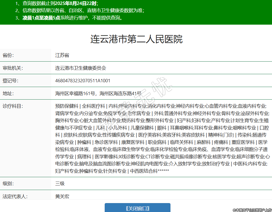 省份:江苏省审批机关:连云港市卫生健康委员会登记号:46804783232070511A1001地址:海州区幸福路161号,海州区海连东路41号诊疗科目:预防保健科 | 全科医疗科 | 内科;呼吸内科专业;消化内科专业;神经内科专业;心血管内科专业;血液内科专业;肾病学专业;内分泌专业;免疫学专业;老年病专业 | 外科;普通外科专业;神经外科专业;骨科专业;泌尿外科专业;胸外科专业;心脏大血管外科专业;烧伤科专业;整形外科专业 | 妇产科;妇科专业;产科专业;计划生育专业;生殖健康与不孕症专业 | 儿科 | 小儿外科 | 儿童保健科 | 眼科 | 耳鼻咽喉科;耳科专业;鼻科专业;咽喉科专业 | 口腔科 | 皮肤科;皮肤病专业;性传播疾病专业 | 医疗美容科;美容牙科;美容皮肤科 | 精神科(门诊) | 传染科;肠道传染病专业 | 肿瘤科 | 急诊医学科 | 康复医学科 | 职业病科 | 临终关怀科 | 麻醉科 | 疼痛科 | 重症医学科 | 医学检验科;临床体液、血液专业;临床微生物学专业;临床化学检验专业;临床免疫、血清学专业;临床细胞分子遗传学专业 | 病理科 | 医学影像科;X线诊断专业;CT诊断专业;磁共振成像诊断专业;核医学专业;超声诊断专业;心电诊断专业;脑电及脑血流图诊断专业;神经肌肉电图专业;介入放射学专业;放射治疗专业 | 中医科;内科专业;妇产科专业;肿瘤科专业;针灸科专业 | 中西医结合科******级别:三级法定代表人:黄关宏主要负责人:黄宏志执业许可证有效期:2022/01/18 -至- 2037/01/17 -