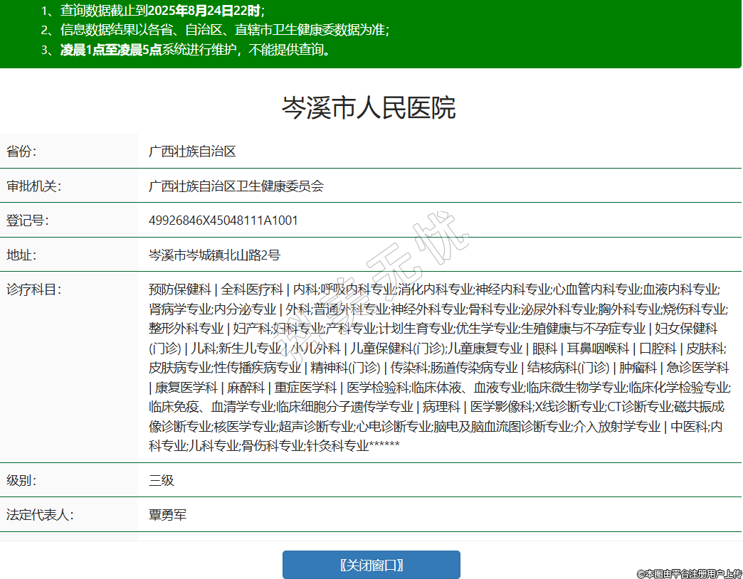 省份:广西壮族自治区审批机关:广西壮族自治区卫生健康委员会登记号:49926846X45048111A1001地址:岑溪市岑城镇北山路2号诊疗科目:预防保健科 | 全科医疗科 | 内科;呼吸内科专业;消化内科专业;神经内科专业;心血管内科专业;血液内科专业;肾病学专业;内分泌专业 | 外科;普通外科专业;神经外科专业;骨科专业;泌尿外科专业;胸外科专业;烧伤科专业;整形外科专业 | 妇产科;妇科专业;产科专业;计划生育专业;优生学专业;生殖健康与不孕症专业 | 妇女保健科(门诊) | 儿科;新生儿专业 | 小儿外科 | 儿童保健科(门诊);儿童康复专业 | 眼科 | 耳鼻咽喉科 | 口腔科 | 皮肤科;皮肤病专业;性传播疾病专业 | 精神科(门诊) | 传染科;肠道传染病专业 | 结核病科(门诊) | 肿瘤科 | 急诊医学科 | 康复医学科 | 麻醉科 | 重症医学科 | 医学检验科;临床体液、血液专业;临床微生物学专业;临床化学检验专业;临床免疫、血清学专业;临床细胞分子遗传学专业 | 病理科 | 医学影像科;X线诊断专业;CT诊断专业;磁共振成像诊断专业;核医学专业;超声诊断专业;心电诊断专业;脑电及脑血流图诊断专业;介入放射学专业 | 中医科;内科专业;儿科专业;骨伤科专业;针灸科专业******级别:三级法定代表人:覃勇军主要负责人:覃勇军执业许可证有效期:2020/10/27 -至- 2035/10/26 -