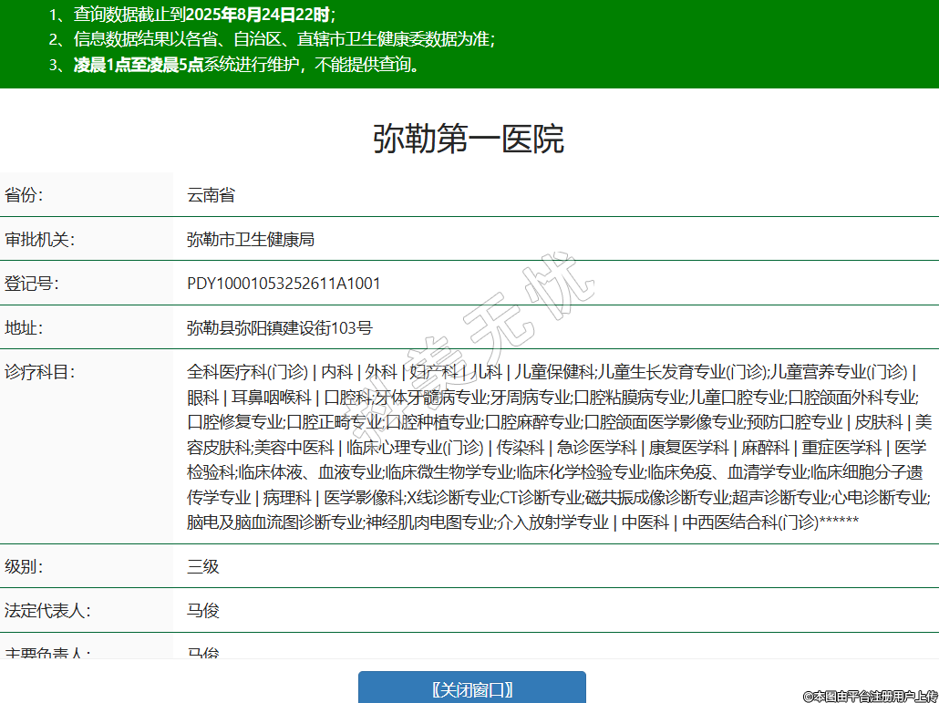 省份:云南省审批机关:弥勒市卫生健康局登记号:PDY10001053252611A1001地址:弥勒县弥阳镇建设街103号诊疗科目:全科医疗科(门诊) | 内科 | 外科 | 妇产科 | 儿科 | 儿童保健科;儿童生长发育专业(门诊);儿童营养专业(门诊) | 眼科 | 耳鼻咽喉科 | 口腔科;牙体牙髓病专业;牙周病专业;口腔粘膜病专业;儿童口腔专业;口腔颌面外科专业;口腔修复专业;口腔正畸专业;口腔种植专业;口腔麻醉专业;口腔颌面医学影像专业;预防口腔专业 | 皮肤科 | 美容皮肤科;美容中医科 | 临床心理专业(门诊) | 传染科 | 急诊医学科 | 康复医学科 | 麻醉科 | 重症医学科 | 医学检验科;临床体液、血液专业;临床微生物学专业;临床化学检验专业;临床免疫、血清学专业;临床细胞分子遗传学专业 | 病理科 | 医学影像科;X线诊断专业;CT诊断专业;磁共振成像诊断专业;超声诊断专业;心电诊断专业;脑电及脑血流图诊断专业;神经肌肉电图专业;介入放射学专业 | 中医科 | 中西医结合科(门诊)******级别:三级法定代表人:马俊主要负责人:马俊执业许可证有效期:2025/08/08 -至- 2038/05/04 -
