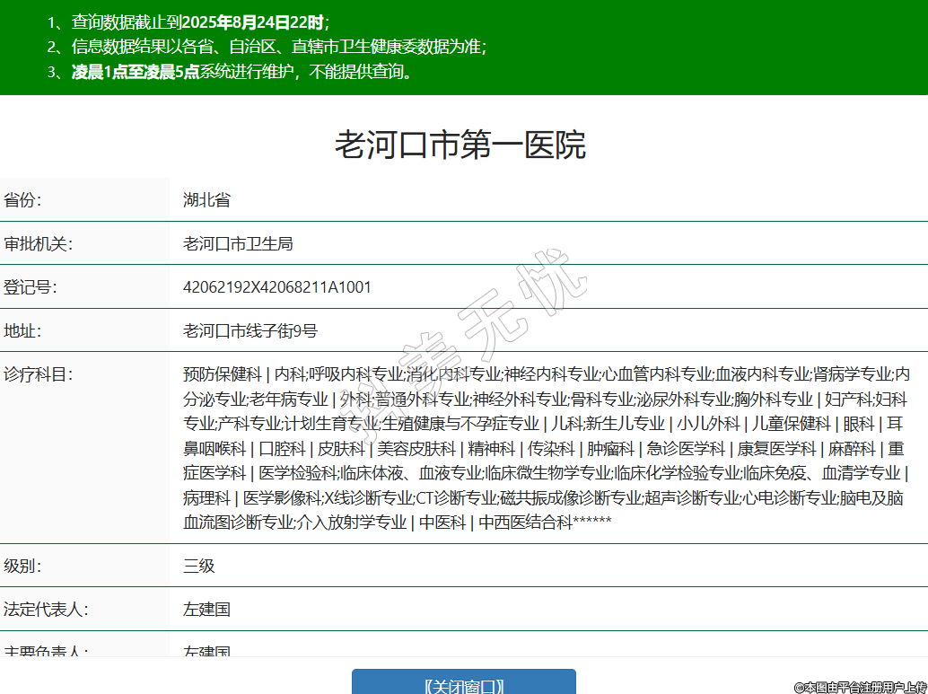 省份:湖北省审批机关:老河口市卫生局登记号:42062192X42068211A1001地址:老河口市线子街9号诊疗科目:预防保健科 | 内科;呼吸内科专业;消化内科专业;神经内科专业;心血管内科专业;血液内科专业;肾病学专业;内分泌专业;老年病专业 | 外科;普通外科专业;神经外科专业;骨科专业;泌尿外科专业;胸外科专业 | 妇产科;妇科专业;产科专业;计划生育专业;生殖健康与不孕症专业 | 儿科;新生儿专业 | 小儿外科 | 儿童保健科 | 眼科 | 耳鼻咽喉科 | 口腔科 | 皮肤科 | 美容皮肤科 | 精神科 | 传染科 | 肿瘤科 | 急诊医学科 | 康复医学科 | 麻醉科 | 重症医学科 | 医学检验科;临床体液、血液专业;临床微生物学专业;临床化学检验专业;临床免疫、血清学专业 | 病理科 | 医学影像科;X线诊断专业;CT诊断专业;磁共振成像诊断专业;超声诊断专业;心电诊断专业;脑电及脑血流图诊断专业;介入放射学专业 | 中医科 | 中西医结合科******级别:三级法定代表人:左建国主要负责人:左建国执业许可证有效期:2011/11/07 -至- 2023/06/11 -