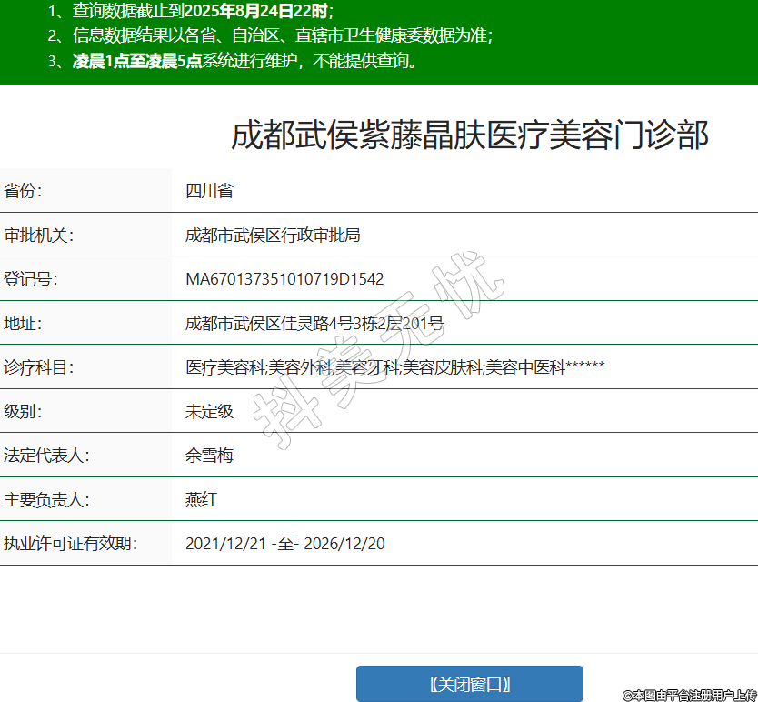 成都武侯紫藤晶肤医疗美容门诊部,诊疗科目:医疗美容科;美容外科;美容牙科;美容皮肤科;美容中医科******