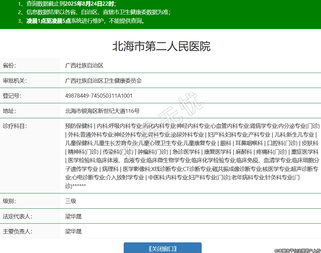 省份:广西壮族自治区审批机关:广西壮族自治区卫生健康委员会登记号:49878449-745050311A1001地址:北海市银海区新世纪大道116号诊疗科目:预防保健科 | 内科;呼吸内科专业;消化内科专业;神经内科专业;心血管内科专业;肾病学专业;内分泌专业(门诊) | 外科;普通外科专业;神经外科专业;骨科专业;泌尿外科专业 | 妇产科;妇科专业;产科专业 | 儿科;新生儿专业 | 儿童保健科;儿童生长发育专业;儿童心理卫生专业;儿童康复专业 | 眼科 | 耳鼻咽喉科 | 口腔科(门诊) | 皮肤科 | 精神科(门诊) | 传染科(门诊) | 肿瘤科(门诊) | 急诊医学科 | 康复医学科 | 麻醉科 | 疼痛科(门诊) | 重症医学科 | 医学检验科;临床体液、血液专业;临床微生物学专业;临床化学检验专业;临床免疫、血清学专业;临床细胞分子遗传学专业 | 病理科 | 医学影像科;X线诊断专业;CT诊断专业;磁共振成像诊断专业;核医学专业;超声诊断专业;心电诊断专业;介入放射学专业 | 中医科;内科专业;妇产科专业(门诊);老年病科专业;针灸科专业(门诊)******级别:三级法定代表人:梁华晟主要负责人:梁华晟执业许可证有效期:2022/12/16 -至- 2037/12/15 -