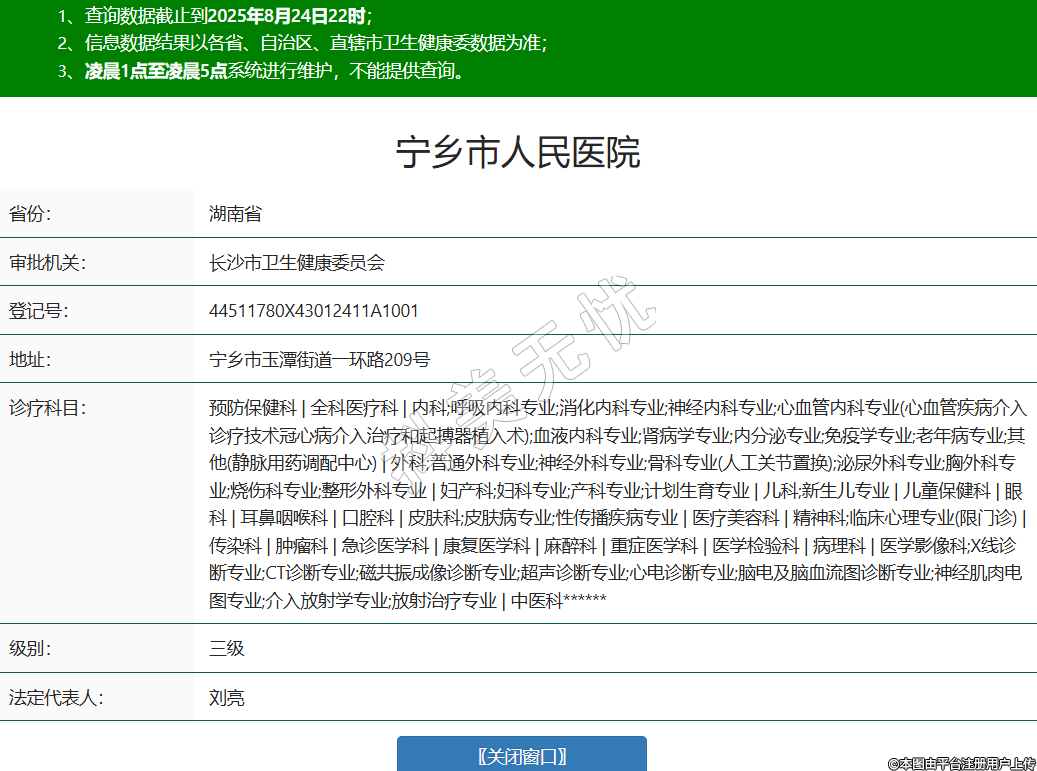 省份:湖南省审批机关:长沙市卫生健康委员会登记号:44511780X43012411A1001地址:宁乡市玉潭街道一环路209号诊疗科目:预防保健科 | 全科医疗科 | 内科;呼吸内科专业;消化内科专业;神经内科专业;心血管内科专业(心血管疾病介入诊疗技术冠心病介入治疗和起搏器植入术);血液内科专业;肾病学专业;内分泌专业;免疫学专业;老年病专业;其他(静脉用药调配中心) | 外科;普通外科专业;神经外科专业;骨科专业(人工关节置换);泌尿外科专业;胸外科专业;烧伤科专业;整形外科专业 | 妇产科;妇科专业;产科专业;计划生育专业 | 儿科;新生儿专业 | 儿童保健科 | 眼科 | 耳鼻咽喉科 | 口腔科 | 皮肤科;皮肤病专业;性传播疾病专业 | 医疗美容科 | 精神科;临床心理专业(限门诊) | 传染科 | 肿瘤科 | 急诊医学科 | 康复医学科 | 麻醉科 | 重症医学科 | 医学检验科 | 病理科 | 医学影像科;X线诊断专业;CT诊断专业;磁共振成像诊断专业;超声诊断专业;心电诊断专业;脑电及脑血流图诊断专业;神经肌肉电图专业;介入放射学专业;放射治疗专业 | 中医科******级别:三级法定代表人:刘亮主要负责人:刘亮执业许可证有效期:2024/04/02 -至- 2029/04/01 -