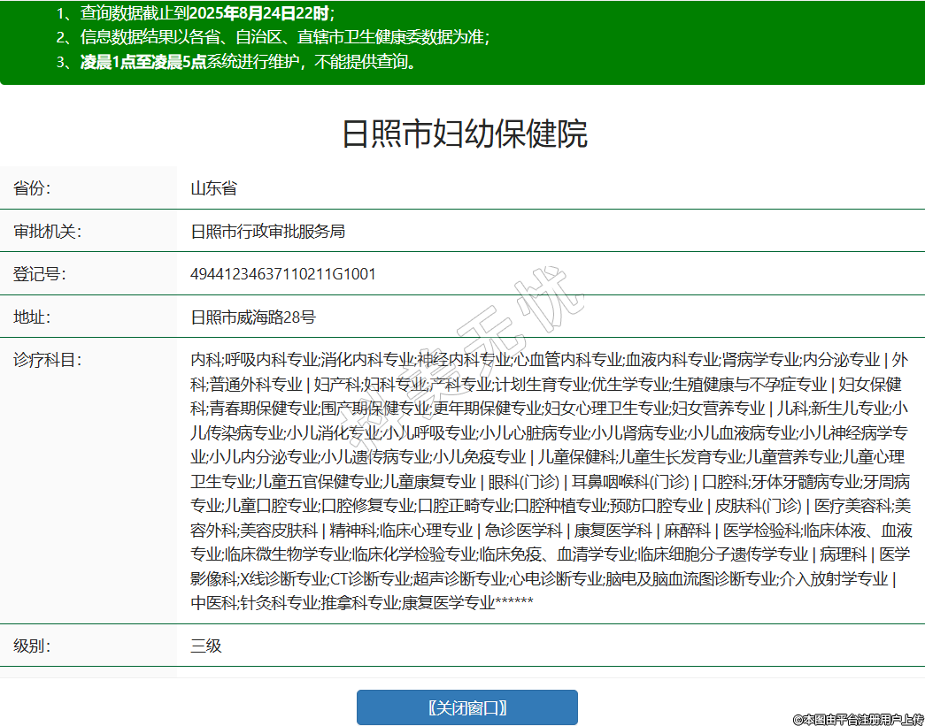 省份:山东省审批机关:日照市行政审批服务局登记号:49441234637110211G1001地址:日照市威海路28号诊疗科目:内科;呼吸内科专业;消化内科专业;神经内科专业;心血管内科专业;血液内科专业;肾病学专业;内分泌专业 | 外科;普通外科专业 | 妇产科;妇科专业;产科专业;计划生育专业;优生学专业;生殖健康与不孕症专业 | 妇女保健科;青春期保健专业;围产期保健专业;更年期保健专业;妇女心理卫生专业;妇女营养专业 | 儿科;新生儿专业;小儿传染病专业;小儿消化专业;小儿呼吸专业;小儿心脏病专业;小儿肾病专业;小儿血液病专业;小儿神经病学专业;小儿内分泌专业;小儿遗传病专业;小儿免疫专业 | 儿童保健科;儿童生长发育专业;儿童营养专业;儿童心理卫生专业;儿童五官保健专业;儿童康复专业 | 眼科(门诊) | 耳鼻咽喉科(门诊) | 口腔科;牙体牙髓病专业;牙周病专业;儿童口腔专业;口腔修复专业;口腔正畸专业;口腔种植专业;预防口腔专业 | 皮肤科(门诊) | 医疗美容科;美容外科;美容皮肤科 | 精神科;临床心理专业 | 急诊医学科 | 康复医学科 | 麻醉科 | 医学检验科;临床体液、血液专业;临床微生物学专业;临床化学检验专业;临床免疫、血清学专业;临床细胞分子遗传学专业 | 病理科 | 医学影像科;X线诊断专业;CT诊断专业;超声诊断专业;心电诊断专业;脑电及脑血流图诊断专业;介入放射学专业 | 中医科;针灸科专业;推拿科专业;康复医学专业******级别:三级法定代表人:牟善季主要负责人:徐祥文执业许可证有效期:2025/04/17 -至- 2032/01/18 -