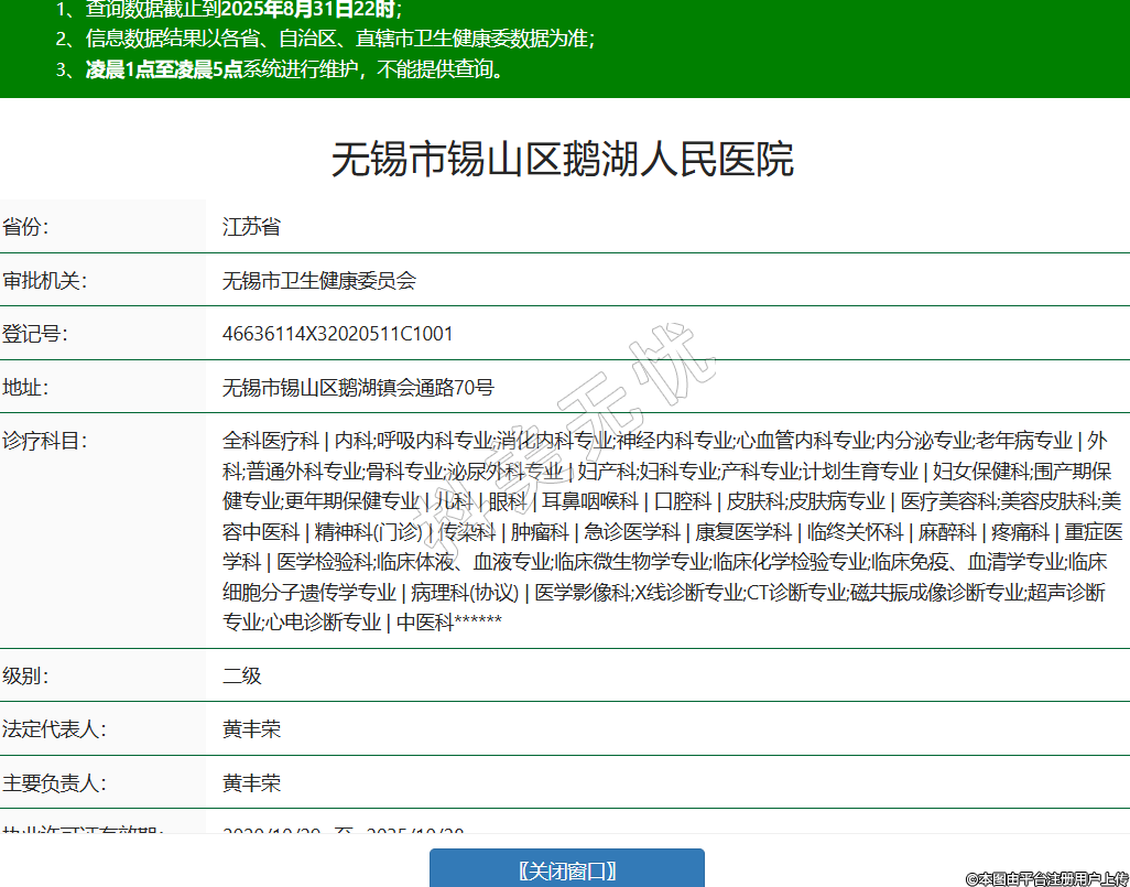 省份:江苏省审批机关:无锡市卫生健康委员会登记号:46636114X32020511C1001地址:无锡市锡山区鹅湖镇会通路70号诊疗科目:全科医疗科 | 内科;呼吸内科专业;消化内科专业;神经内科专业;心血管内科专业;内分泌专业;老年病专业 | 外科;普通外科专业;骨科专业;泌尿外科专业 | 妇产科;妇科专业;产科专业;计划生育专业 | 妇女保健科;围产期保健专业;更年期保健专业 | 儿科 | 眼科 | 耳鼻咽喉科 | 口腔科 | 皮肤科;皮肤病专业 | 医疗美容科;美容皮肤科;美容中医科 | 精神科(门诊) | 传染科 | 肿瘤科 | 急诊医学科 | 康复医学科 | 临终关怀科 | 麻醉科 | 疼痛科 | 重症医学科 | 医学检验科;临床体液、血液专业;临床微生物学专业;临床化学检验专业;临床免疫、血清学专业;临床细胞分子遗传学专业 | 病理科(协议) | 医学影像科;X线诊断专业;CT诊断专业;磁共振成像诊断专业;超声诊断专业;心电诊断专业 | 中医科******级别:二级法定代表人:黄丰荣主要负责人:黄丰荣执业许可证有效期:2020/10/29 -至- 2035/10/28 -