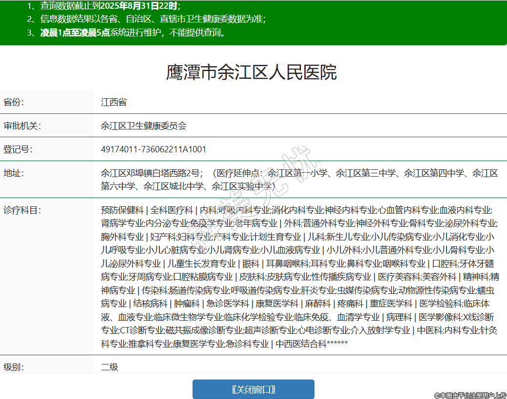 省份:江西省审批机关:余江区卫生健康委员会登记号:49174011-736062211A1001地址:余江区邓埠镇白塔西路2号;(医疗延伸点:余江区第一小学、余江区第三中学、余江区第四中学、余江区第六中学、余江区城北中学、余江区实验中学)诊疗科目:预防保健科 | 全科医疗科 | 内科;呼吸内科专业;消化内科专业;神经内科专业;心血管内科专业;血液内科专业;肾病学专业;内分泌专业;免疫学专业;老年病专业 | 外科;普通外科专业;神经外科专业;骨科专业;泌尿外科专业;胸外科专业 | 妇产科;妇科专业;产科专业;计划生育专业 | 儿科;新生儿专业;小儿传染病专业;小儿消化专业;小儿呼吸专业;小儿心脏病专业;小儿肾病专业;小儿血液病专业 | 小儿外科;小儿普通外科专业;小儿骨科专业;小儿泌尿外科专业 | 儿童生长发育专业 | 眼科 | 耳鼻咽喉科;耳科专业;鼻科专业;咽喉科专业 | 口腔科;牙体牙髓病专业;牙周病专业;口腔粘膜病专业 | 皮肤科;皮肤病专业;性传播疾病专业 | 医疗美容科;美容外科 | 精神科;精神病专业 | 传染科;肠道传染病专业;呼吸道传染病专业;肝炎专业;虫媒传染病专业;动物源性传染病专业;蠕虫病专业 | 结核病科 | 肿瘤科 | 急诊医学科 | 康复医学科 | 麻醉科 | 疼痛科 | 重症医学科 | 医学检验科;临床体液、血液专业;临床微生物学专业;临床化学检验专业;临床免疫、血清学专业 | 病理科 | 医学影像科;X线诊断专业;CT诊断专业;磁共振成像诊断专业;超声诊断专业;心电诊断专业;介入放射学专业 | 中医科;内科专业;针灸科专业;推拿科专业;康复医学专业;急诊科专业 | 中西医结合科******级别:二级法定代表人:杨伟主要负责人:苏莉执业许可证有效期:2015/11/04 -至- 2030/11/03 -