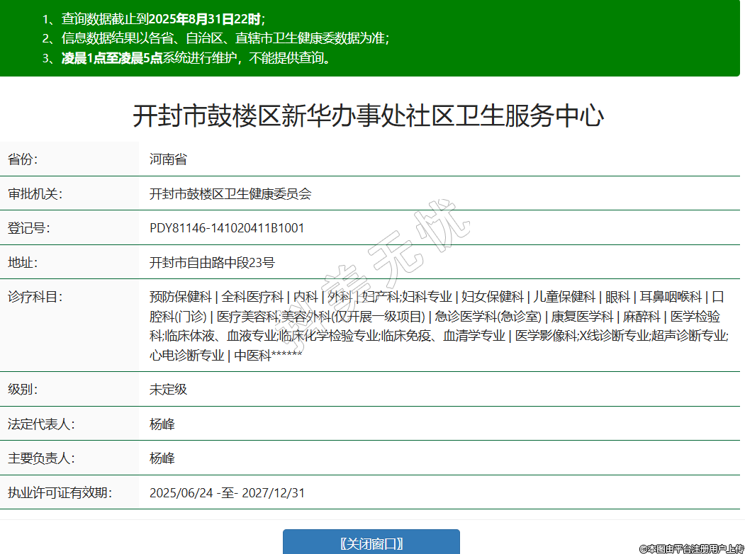 省份:河南省审批机关:开封市鼓楼区卫生健康委员会登记号:PDY81146-141020411B1001地址:开封市自由路中段23号诊疗科目:预防保健科 | 全科医疗科 | 内科 | 外科 | 妇产科;妇科专业 | 妇女保健科 | 儿童保健科 | 眼科 | 耳鼻咽喉科 | 口腔科(门诊) | 医疗美容科;美容外科(仅开展一级项目) | 急诊医学科(急诊室) | 康复医学科 | 麻醉科 | 医学检验科;临床体液、血液专业;临床化学检验专业;临床免疫、血清学专业 | 医学影像科;X线诊断专业;超声诊断专业;心电诊断专业 | 中医科******级别:未定级法定代表人:杨峰主要负责人:杨峰执业许可证有效期:2025/06/24 -至- 2027/12/31 -