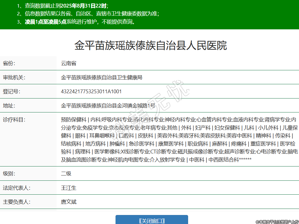 省份:云南省审批机关:金平苗族瑶族傣族自治县卫生健康局登记号:43224217753253011A1001地址:金平苗族瑶族傣族自治县金河镇金城路1号诊疗科目:预防保健科 | 内科;呼吸内科专业;消化内科专业;神经内科专业;心血管内科专业;血液内科专业;肾病学专业;内分泌专业;免疫学专业;变态反应专业;老年病专业;其他 | 外科 | 妇产科 | 妇女保健科 | 儿科 | 小儿外科 | 儿童保健科 | 眼科 | 耳鼻咽喉科 | 口腔科 | 皮肤科 | 美容外科;美容牙科;美容皮肤科;美容中医科 | 精神科 | 传染科 | 结核病科 | 地方病科 | 肿瘤科 | 急诊医学科 | 康复医学科 | 职业病科 | 麻醉科 | 疼痛科 | 重症医学科 | 医学检验科 | 病理科 | 医学影像科;X线诊断专业;CT诊断专业;磁共振成像诊断专业;超声诊断专业;心电诊断专业;脑电及脑血流图诊断专业;神经肌肉电图专业;介入放射学专业 | 中医科 | 中西医结合科******级别:二级法定代表人:王江生主要负责人:唐文斌执业许可证有效期:2025/04/01 -至- 2038/09/14 -