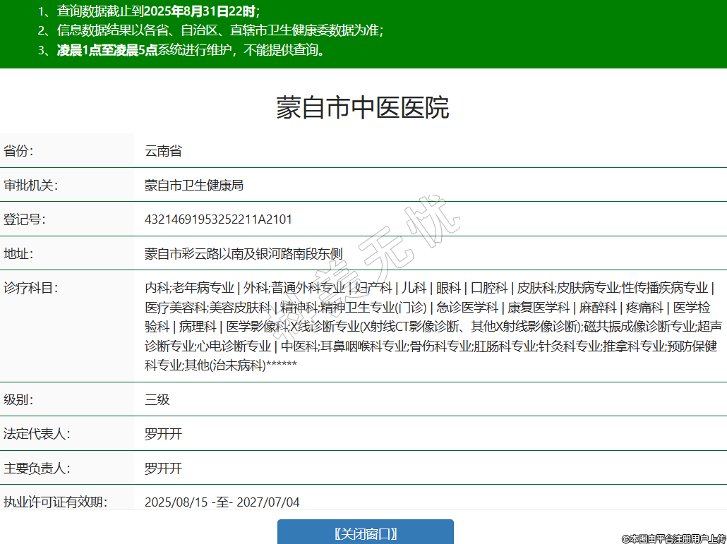 省份:云南省审批机关:蒙自市卫生健康局登记号:43214691953252211A2101地址:蒙自市彩云路以南及银河路南段东侧诊疗科目:内科;老年病专业 | 外科;普通外科专业 | 妇产科 | 儿科 | 眼科 | 口腔科 | 皮肤科;皮肤病专业;性传播疾病专业 | 医疗美容科;美容皮肤科 | 精神科;精神卫生专业(门诊) | 急诊医学科 | 康复医学科 | 麻醉科 | 疼痛科 | 医学检验科 | 病理科 | 医学影像科;X线诊断专业(X射线CT影像诊断、其他X射线影像诊断);磁共振成像诊断专业;超声诊断专业;心电诊断专业 | 中医科;耳鼻咽喉科专业;骨伤科专业;肛肠科专业;针灸科专业;推拿科专业;预防保健科专业;其他(治未病科)******级别:三级法定代表人:罗开开主要负责人:罗开开执业许可证有效期:2025/08/15 -至- 2027/07/04 -