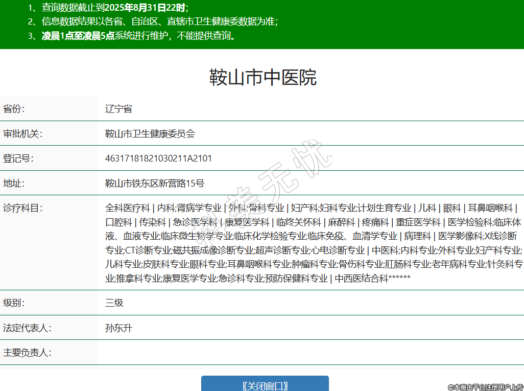 省份:辽宁省审批机关:鞍山市卫生健康委员会登记号:46317181821030211A2101地址:鞍山市铁东区新营路15号诊疗科目:全科医疗科 | 内科;肾病学专业 | 外科;骨科专业 | 妇产科;妇科专业;计划生育专业 | 儿科 | 眼科 | 耳鼻咽喉科 | 口腔科 | 传染科 | 急诊医学科 | 康复医学科 | 临终关怀科 | 麻醉科 | 疼痛科 | 重症医学科 | 医学检验科;临床体液、血液专业;临床微生物学专业;临床化学检验专业;临床免疫、血清学专业 | 病理科 | 医学影像科;X线诊断专业;CT诊断专业;磁共振成像诊断专业;超声诊断专业;心电诊断专业 | 中医科;内科专业;外科专业;妇产科专业;儿科专业;皮肤科专业;眼科专业;耳鼻咽喉科专业;肿瘤科专业;骨伤科专业;肛肠科专业;老年病科专业;针灸科专业;推拿科专业;康复医学专业;急诊科专业;预防保健科专业 | 中西医结合科******级别:三级法定代表人:孙东升主要负责人:执业许可证有效期:2025/08/18 -至- 2031/07/31 -