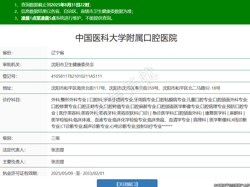 省份:辽宁省审批机关:沈阳市卫生健康委员会登记号:41058117821010211A5111地址:沈阳市和平区南京北街117号、沈阳市沈河区奉天街359号、沈阳市和平区北二马路92-18号诊疗科目:外科;整形外科专业 | 口腔科;牙体牙髓病专业;牙周病专业;口腔粘膜病专业;儿童口腔专业;口腔颌面外科专业;口腔修复专业;口腔正畸专业;口腔种植专业;口腔麻醉专业;口腔颌面医学影像专业;口腔病理专业;预防口腔专业 | 医疗美容科;美容外科;美容牙科;美容皮肤科(门诊) | 急诊医学科(口腔颌面外科) | 康复医学科 | 麻醉科 | 医学检验科;临床体液、血液专业;临床化学检验专业;临床免疫、血清学专业 | 病理科 | 医学影像科;X线诊断专业;CT诊断专业;超声诊断专业;心电诊断专业;放射治疗专业******级别:三级法定代表人:张忠提主要负责人:张忠提执业许可证有效期:2025/05/09 -至- 2033/02/01 -