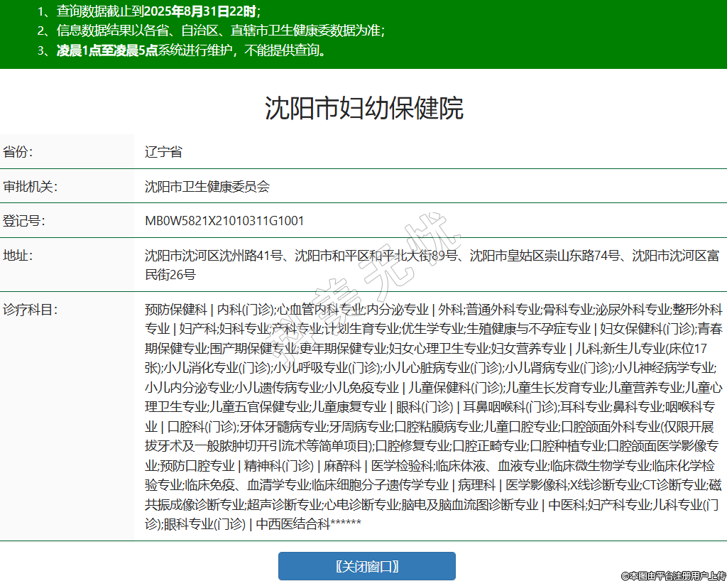 省份:辽宁省审批机关:沈阳市卫生健康委员会登记号:MB0W5821X21010311G1001地址:沈阳市沈河区沈州路41号、沈阳市和平区和平北大街89号、沈阳市皇姑区崇山东路74号、沈阳市沈河区富民街26号诊疗科目:预防保健科 | 内科(门诊);心血管内科专业;内分泌专业 | 外科;普通外科专业;骨科专业;泌尿外科专业;整形外科专业 | 妇产科;妇科专业;产科专业;计划生育专业;优生学专业;生殖健康与不孕症专业 | 妇女保健科(门诊);青春期保健专业;围产期保健专业;更年期保健专业;妇女心理卫生专业;妇女营养专业 | 儿科;新生儿专业(床位17张);小儿消化专业(门诊);小儿呼吸专业(门诊);小儿心脏病专业(门诊);小儿肾病专业(门诊);小儿神经病学专业;小儿内分泌专业;小儿遗传病专业;小儿免疫专业 | 儿童保健科(门诊);儿童生长发育专业;儿童营养专业;儿童心理卫生专业;儿童五官保健专业;儿童康复专业 | 眼科(门诊) | 耳鼻咽喉科(门诊);耳科专业;鼻科专业;咽喉科专业 | 口腔科(门诊);牙体牙髓病专业;牙周病专业;口腔粘膜病专业;儿童口腔专业;口腔颌面外科专业(仅限开展拔牙术及一般脓肿切开引流术等简单项目);口腔修复专业;口腔正畸专业;口腔种植专业;口腔颌面医学影像专业;预防口腔专业 | 精神科(门诊) | 麻醉科 | 医学检验科;临床体液、血液专业;临床微生物学专业;临床化学检验专业;临床免疫、血清学专业;临床细胞分子遗传学专业 | 病理科 | 医学影像科;X线诊断专业;CT诊断专业;磁共振成像诊断专业;超声诊断专业;心电诊断专业;脑电及脑血流图诊断专业 | 中医科;妇产科专业;儿科专业(门诊);眼科专业(门诊) | 中西医结合科******级别:三级法定代表人:李晨阳主要负责人:李晨阳执业许可证有效期:2023/11/01 -至- 2030/05/31 -