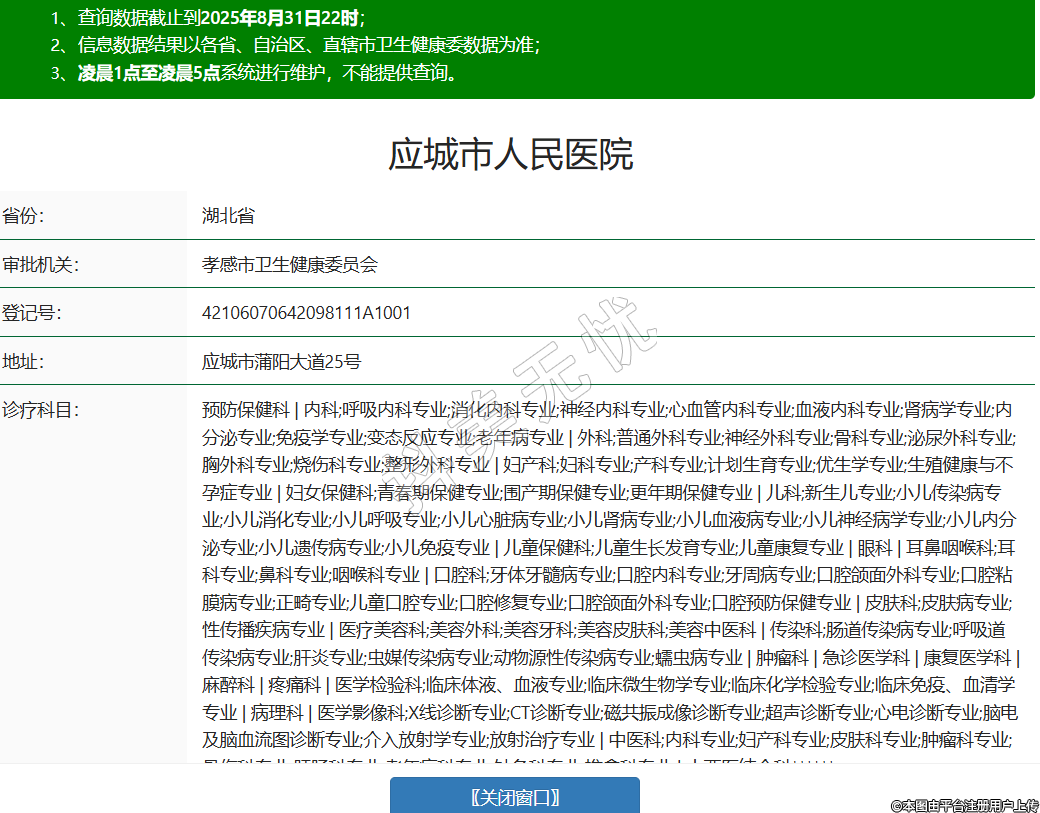 省份:湖北省审批机关:孝感市卫生健康委员会登记号:42106070642098111A1001地址:应城市蒲阳大道25号诊疗科目:预防保健科 | 内科;呼吸内科专业;消化内科专业;神经内科专业;心血管内科专业;血液内科专业;肾病学专业;内分泌专业;免疫学专业;变态反应专业;老年病专业 | 外科;普通外科专业;神经外科专业;骨科专业;泌尿外科专业;胸外科专业;烧伤科专业;整形外科专业 | 妇产科;妇科专业;产科专业;计划生育专业;优生学专业;生殖健康与不孕症专业 | 妇女保健科;青春期保健专业;围产期保健专业;更年期保健专业 | 儿科;新生儿专业;小儿传染病专业;小儿消化专业;小儿呼吸专业;小儿心脏病专业;小儿肾病专业;小儿血液病专业;小儿神经病学专业;小儿内分泌专业;小儿遗传病专业;小儿免疫专业 | 儿童保健科;儿童生长发育专业;儿童康复专业 | 眼科 | 耳鼻咽喉科;耳科专业;鼻科专业;咽喉科专业 | 口腔科;牙体牙髓病专业;口腔内科专业;牙周病专业;口腔颌面外科专业;口腔粘膜病专业;正畸专业;儿童口腔专业;口腔修复专业;口腔颌面外科专业;口腔预防保健专业 | 皮肤科;皮肤病专业;性传播疾病专业 | 医疗美容科;美容外科;美容牙科;美容皮肤科;美容中医科 | 传染科;肠道传染病专业;呼吸道传染病专业;肝炎专业;虫媒传染病专业;动物源性传染病专业;蠕虫病专业 | 肿瘤科 | 急诊医学科 | 康复医学科 | 麻醉科 | 疼痛科 | 医学检验科;临床体液、血液专业;临床微生物学专业;临床化学检验专业;临床免疫、血清学专业 | 病理科 | 医学影像科;X线诊断专业;CT诊断专业;磁共振成像诊断专业;超声诊断专业;心电诊断专业;脑电及脑血流图诊断专业;介入放射学专业;放射治疗专业 | 中医科;内科专业;妇产科专业;皮肤科专业;肿瘤科专业;骨伤科专业;肛肠科专业;老年病科专业;针灸科专业;推拿科专业 | 中西医结合科******级别:三级法定代表人:魏敏主要负责人:姚海泉执业许可证有效期:2008/01/01 -至- 2022/12/31 -