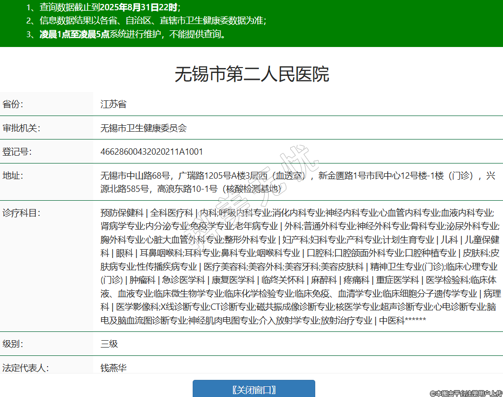 省份:江苏省审批机关:无锡市卫生健康委员会登记号:46628600432020211A1001地址:无锡市中山路68号,广瑞路1205号A楼3层西(血透室),新金匮路1号市民中心12号楼-1楼(门诊),兴源北路585号,高浪东路10-1号(核酸检测基地)诊疗科目:预防保健科 | 全科医疗科 | 内科;呼吸内科专业;消化内科专业;神经内科专业;心血管内科专业;血液内科专业;肾病学专业;内分泌专业;免疫学专业;老年病专业 | 外科;普通外科专业;神经外科专业;骨科专业;泌尿外科专业;胸外科专业;心脏大血管外科专业;整形外科专业 | 妇产科;妇科专业;产科专业;计划生育专业 | 儿科 | 儿童保健科 | 眼科 | 耳鼻咽喉科;耳科专业;鼻科专业;咽喉科专业 | 口腔科;口腔颌面外科专业;口腔种植专业 | 皮肤科;皮肤病专业;性传播疾病专业 | 医疗美容科;美容外科;美容牙科;美容皮肤科 | 精神卫生专业(门诊);临床心理专业(门诊) | 肿瘤科 | 急诊医学科 | 康复医学科 | 临终关怀科 | 麻醉科 | 疼痛科 | 重症医学科 | 医学检验科;临床体液、血液专业;临床微生物学专业;临床化学检验专业;临床免疫、血清学专业;临床细胞分子遗传学专业 | 病理科 | 医学影像科;X线诊断专业;CT诊断专业;磁共振成像诊断专业;核医学专业;超声诊断专业;心电诊断专业;脑电及脑血流图诊断专业;神经肌肉电图专业;介入放射学专业;放射治疗专业 | 中医科******级别:三级法定代表人:钱燕华主要负责人:钱燕华执业许可证有效期:2020/09/12 -至- 2035/09/11 -