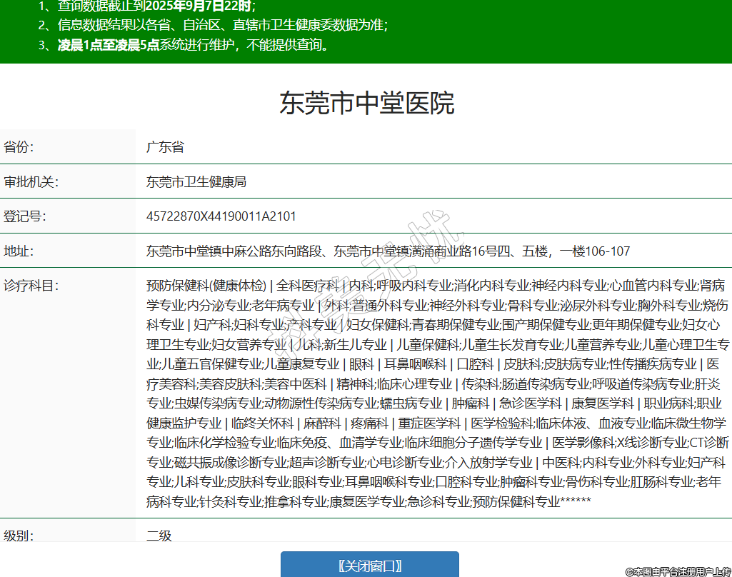省份:广东省审批机关:东莞市卫生健康局登记号:45722870X44190011A2101地址:东莞市中堂镇中麻公路东向路段、东莞市中堂镇潢涌商业路16号四、五楼,一楼106-107诊疗科目:预防保健科(健康体检) | 全科医疗科 | 内科;呼吸内科专业;消化内科专业;神经内科专业;心血管内科专业;肾病学专业;内分泌专业;老年病专业 | 外科;普通外科专业;神经外科专业;骨科专业;泌尿外科专业;胸外科专业;烧伤科专业 | 妇产科;妇科专业;产科专业 | 妇女保健科;青春期保健专业;围产期保健专业;更年期保健专业;妇女心理卫生专业;妇女营养专业 | 儿科;新生儿专业 | 儿童保健科;儿童生长发育专业;儿童营养专业;儿童心理卫生专业;儿童五官保健专业;儿童康复专业 | 眼科 | 耳鼻咽喉科 | 口腔科 | 皮肤科;皮肤病专业;性传播疾病专业 | 医疗美容科;美容皮肤科;美容中医科 | 精神科;临床心理专业 | 传染科;肠道传染病专业;呼吸道传染病专业;肝炎专业;虫媒传染病专业;动物源性传染病专业;蠕虫病专业 | 肿瘤科 | 急诊医学科 | 康复医学科 | 职业病科;职业健康监护专业 | 临终关怀科 | 麻醉科 | 疼痛科 | 重症医学科 | 医学检验科;临床体液、血液专业;临床微生物学专业;临床化学检验专业;临床免疫、血清学专业;临床细胞分子遗传学专业 | 医学影像科;X线诊断专业;CT诊断专业;磁共振成像诊断专业;超声诊断专业;心电诊断专业;介入放射学专业 | 中医科;内科专业;外科专业;妇产科专业;儿科专业;皮肤科专业;眼科专业;耳鼻咽喉科专业;口腔科专业;肿瘤科专业;骨伤科专业;肛肠科专业;老年病科专业;针灸科专业;推拿科专业;康复医学专业;急诊科专业;预防保健科专业******级别:二级法定代表人:黎锐波主要负责人:黎锐波执业许可证有效期:2025/02/26 -至- 2039/12/13 -