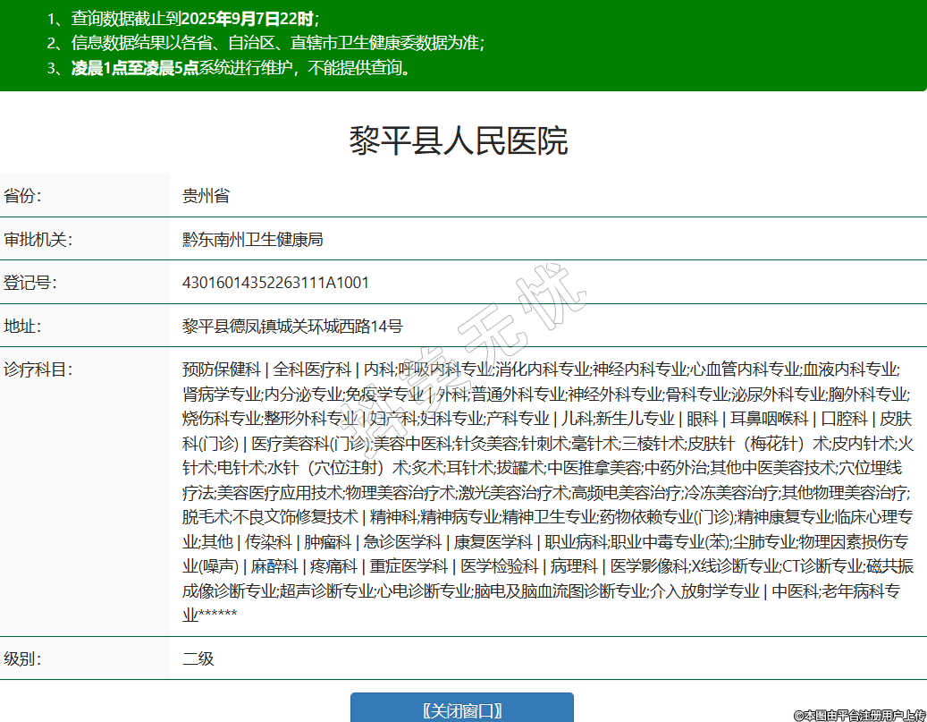 省份:贵州省审批机关:黔东南州卫生健康局登记号:43016014352263111A1001地址:黎平县德凤镇城关环城西路14号诊疗科目:预防保健科 | 全科医疗科 | 内科;呼吸内科专业;消化内科专业;神经内科专业;心血管内科专业;血液内科专业;肾病学专业;内分泌专业;免疫学专业 | 外科;普通外科专业;神经外科专业;骨科专业;泌尿外科专业;胸外科专业;烧伤科专业;整形外科专业 | 妇产科;妇科专业;产科专业 | 儿科;新生儿专业 | 眼科 | 耳鼻咽喉科 | 口腔科 | 皮肤科(门诊) | 医疗美容科(门诊);美容中医科;针灸美容;针刺术;毫针术;三棱针术;皮肤针(梅花针)术;皮内针术;火针术;电针术;水针(穴位注射)术;炙术;耳针术;拔罐术;中医推拿美容;中药外治;其他中医美容技术;穴位埋线疗法;美容医疗应用技术;物理美容治疗术;激光美容治疗术;高频电美容治疗;冷冻美容治疗;其他物理美容治疗;脱毛术;不良文饰修复技术 | 精神科;精神病专业;精神卫生专业;药物依赖专业(门诊);精神康复专业;临床心理专业;其他 | 传染科 | 肿瘤科 | 急诊医学科 | 康复医学科 | 职业病科;职业中毒专业(苯);尘肺专业;物理因素损伤专业(噪声) | 麻醉科 | 疼痛科 | 重症医学科 | 医学检验科 | 病理科 | 医学影像科;X线诊断专业;CT诊断专业;磁共振成像诊断专业;超声诊断专业;心电诊断专业;脑电及脑血流图诊断专业;介入放射学专业 | 中医科;老年病科专业******级别:二级法定代表人:李勇主要负责人:李勇执业许可证有效期:2025/05/12 -至- 2040/05/11 -