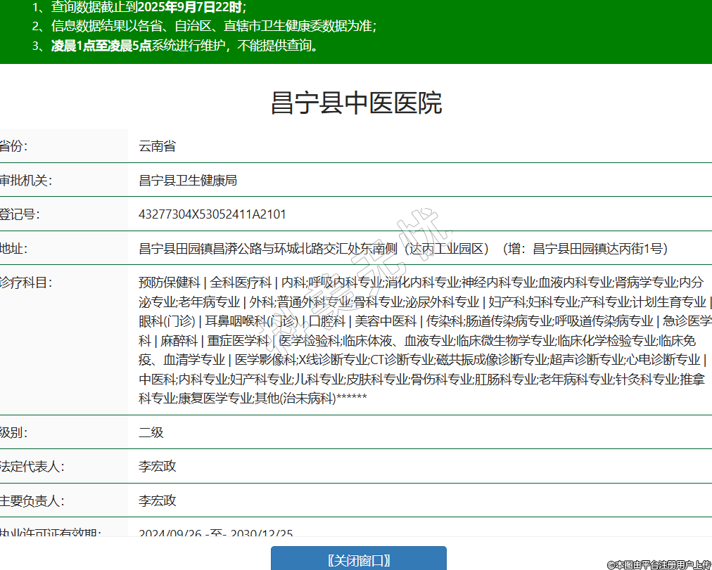 省份:云南省审批机关:昌宁县卫生健康局登记号:43277304X53052411A2101地址:昌宁县田园镇昌漭公路与环城北路交汇处东南侧(达丙工业园区)(增:昌宁县田园镇达丙街1号)诊疗科目:预防保健科 | 全科医疗科 | 内科;呼吸内科专业;消化内科专业;神经内科专业;血液内科专业;肾病学专业;内分泌专业;老年病专业 | 外科;普通外科专业;骨科专业;泌尿外科专业 | 妇产科;妇科专业;产科专业;计划生育专业 | 眼科(门诊) | 耳鼻咽喉科(门诊) | 口腔科 | 美容中医科 | 传染科;肠道传染病专业;呼吸道传染病专业 | 急诊医学科 | 麻醉科 | 重症医学科 | 医学检验科;临床体液、血液专业;临床微生物学专业;临床化学检验专业;临床免疫、血清学专业 | 医学影像科;X线诊断专业;CT诊断专业;磁共振成像诊断专业;超声诊断专业;心电诊断专业 | 中医科;内科专业;妇产科专业;儿科专业;皮肤科专业;骨伤科专业;肛肠科专业;老年病科专业;针灸科专业;推拿科专业;康复医学专业;其他(治未病科)******级别:二级法定代表人:李宏政主要负责人:李宏政执业许可证有效期:2024/09/26 -至- 2030/12/25 -