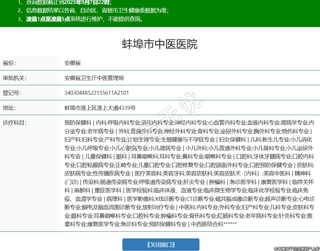 省份:安徽省审批机关:安徽省卫生厅中医管理局登记号:34030448522155611A2101地址:蚌埠市淮上区淮上大道4339号诊疗科目:预防保健科 | 内科;呼吸内科专业;消化内科专业;神经内科专业;心血管内科专业;血液内科专业;肾病学专业;内分泌专业;老年病专业 | 外科;普通外科专业;神经外科专业;骨科专业;泌尿外科专业;胸外科专业;烧伤科专业 | 妇产科;妇科专业;产科专业;计划生育专业;生殖健康与不孕症专业 | 妇女保健科 | 儿科;新生儿专业;小儿消化专业;小儿呼吸专业;小儿心脏病专业;小儿肾病专业 | 小儿外科;小儿普通外科专业;小儿骨科专业;小儿泌尿外科专业 | 儿童保健科 | 眼科 | 耳鼻咽喉科;耳科专业;鼻科专业;咽喉科专业 | 口腔科;牙体牙髓病专业;口腔内科专业;口腔粘膜病专业;正畸专业;儿童口腔专业;口腔修复专业;口腔颌面外科专业;口腔预防保健专业 | 皮肤科;皮肤病专业;性传播疾病专业 | 医疗美容科;美容牙科;美容皮肤科;美容皮肤术(内科);美容中医科 | 精神科(门诊) | 传染科;肠道传染病专业;呼吸道传染病专业;肝炎专业 | 肿瘤科 | 急诊医学科 | 康复医学科 | 临终关怀科 | 麻醉科 | 重症医学科 | 医学检验科;临床体液、血液专业;临床微生物学专业;临床化学检验专业;临床免疫、血清学专业 | 病理科 | 医学影像科;X线诊断专业;CT诊断专业;磁共振成像诊断专业;超声诊断专业;心电诊断专业;脑电及脑血流图诊断专业;放射治疗专业 | 中医科;内科专业;外科专业;妇产科专业;儿科专业;皮肤科专业;眼科专业;耳鼻咽喉科专业;口腔科专业;肿瘤科专业;骨伤科专业;肛肠科专业;老年病科专业;针灸科专业;推拿科专业;康复医学专业;急诊科专业;预防保健科专业 | 中西医结合科******级别:三级法定代表人:崔北勇主要负责人:崔北勇执业许可证有效期:2017/08/16 -至- 2032/08/16 -