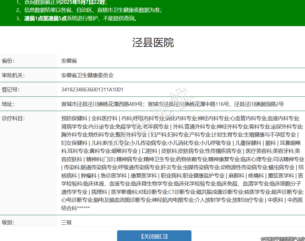 省份:安徽省审批机关:安徽省卫生健康委员会登记号:34182348636001311A1001地址:宣城市泾县泾川镇桃花潭西路489号;宣城市泾县泾川镇桃花潭中路116号,泾县泾川镇谢园路2号诊疗科目:预防保健科 | 全科医疗科 | 内科;呼吸内科专业;消化内科专业;神经内科专业;心血管内科专业;血液内科专业;肾病学专业;内分泌专业;免疫学专业;老年病专业 | 外科;普通外科专业;神经外科专业;骨科专业;泌尿外科专业;胸外科专业;烧伤科专业;整形外科专业 | 妇产科;妇科专业;产科专业;计划生育专业;生殖健康与不孕症专业 | 妇女保健科 | 儿科;新生儿专业;小儿传染病专业;小儿消化专业;小儿呼吸专业 | 儿童保健科 | 眼科 | 耳鼻咽喉科;耳科专业;鼻科专业;咽喉科专业 | 口腔科 | 皮肤科;皮肤病专业;性传播疾病专业 | 医疗美容科;美容牙科;美容皮肤科 | 精神科(门诊);精神病专业;精神卫生专业;药物依赖专业;精神康复专业;临床心理专业;司法精神专业 | 传染科;肠道传染病专业;呼吸道传染病专业;肝炎专业;虫媒传染病专业;动物源性传染病专业;蠕虫病专业 | 结核病科 | 肿瘤科 | 急诊医学科 | 康复医学科 | 职业病科;职业健康监护专业 | 麻醉科 | 疼痛科 | 重症医学科 | 医学检验科;临床体液、血液专业;临床微生物学专业;临床化学检验专业;临床免疫、血清学专业;临床细胞分子遗传学专业 | 病理科 | 医学影像科;X线诊断专业;CT诊断专业;磁共振成像诊断专业;核医学专业;超声诊断专业;心电诊断专业;脑电及脑血流图诊断专业;神经肌肉电图专业;介入放射学专业;放射治疗专业 | 中医科 | 中西医结合科******级别:三级法定代表人:潘志刚主要负责人:潘志刚执业许可证有效期:2023/11/17 -至- 2035/11/11 -
