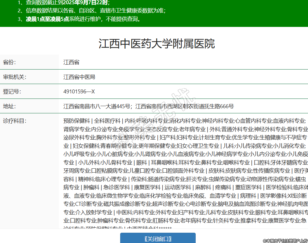 省份:江西省审批机关:江西省中医局登记号:49101596—X地址:江西省南昌市八一大道445号;江西省南昌市西湖区朝农街道抚生路666号诊疗科目:预防保健科 | 全科医疗科 | 内科;呼吸内科专业;消化内科专业;神经内科专业;心血管内科专业;血液内科专业;肾病学专业;内分泌专业;免疫学专业;变态反应专业;老年病专业 | 外科;普通外科专业;神经外科专业;骨科专业;泌尿外科专业;胸外科专业;整形外科专业 | 妇产科;妇科专业;计划生育专业;优生学专业;生殖健康与不孕症专业 | 妇女保健科;青春期保健专业;更年期保健专业;妇女心理卫生专业 | 儿科;小儿传染病专业;小儿消化专业;小儿呼吸专业;小儿心脏病专业;小儿肾病专业;小儿血液病专业;小儿神经病学专业;小儿内分泌专业;小儿免疫专业 | 小儿外科;小儿骨科专业 | 眼科 | 耳鼻咽喉科;耳科专业;鼻科专业;咽喉科专业 | 口腔科;牙体牙髓病专业;牙周病专业;口腔粘膜病专业;儿童口腔专业;口腔颌面外科专业 | 皮肤科;皮肤病专业;性传播疾病专业 | 医疗美容科 | 精神科;临床心理专业 | 传染科;肠道传染病专业;肝炎专业;虫媒传染病专业;动物源性传染病专业;蠕虫病专业 | 肿瘤科 | 急诊医学科 | 康复医学科 | 运动医学科 | 麻醉科 | 疼痛科 | 重症医学科 | 医学检验科;临床体液、血液专业;临床微生物学专业;临床化学检验专业;临床免疫、血清学专业 | 病理科 | 医学影像科;X线诊断专业;CT诊断专业;磁共振成像诊断专业;超声诊断专业;心电诊断专业;脑电及脑血流图诊断专业;神经肌肉电图专业;介入放射学专业 | 中医科;内科专业;外科专业;妇产科专业;儿科专业;皮肤科专业;眼科专业;耳鼻咽喉科专业;口腔科专业;肿瘤科专业;骨伤科专业;肛肠科专业;老年病科专业;针灸科专业;推拿科专业;康复医学专业;急诊科专业;预防保健科专业 | 中西医结合科******级别:三级法定代表人:刘良徛主要负责人:刘良徛执业许可证有效期:2023/06/05 -至- 2036/07/07 -