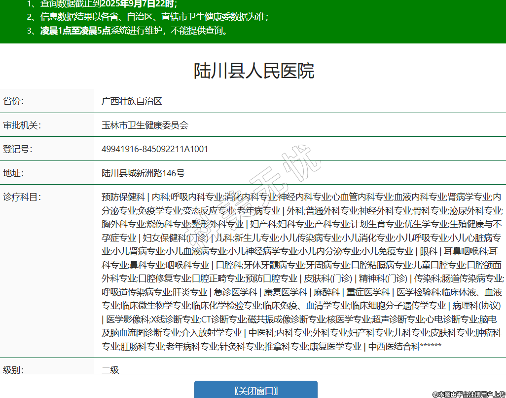 省份:广西壮族自治区审批机关:玉林市卫生健康委员会登记号:49941916-845092211A1001地址:陆川县城新洲路146号诊疗科目:预防保健科 | 内科;呼吸内科专业;消化内科专业;神经内科专业;心血管内科专业;血液内科专业;肾病学专业;内分泌专业;免疫学专业;变态反应专业;老年病专业 | 外科;普通外科专业;神经外科专业;骨科专业;泌尿外科专业;胸外科专业;烧伤科专业;整形外科专业 | 妇产科;妇科专业;产科专业;计划生育专业;优生学专业;生殖健康与不孕症专业 | 妇女保健科(门诊) | 儿科;新生儿专业;小儿传染病专业;小儿消化专业;小儿呼吸专业;小儿心脏病专业;小儿肾病专业;小儿血液病专业;小儿神经病学专业;小儿内分泌专业;小儿免疫专业 | 眼科 | 耳鼻咽喉科;耳科专业;鼻科专业;咽喉科专业 | 口腔科;牙体牙髓病专业;牙周病专业;口腔粘膜病专业;儿童口腔专业;口腔颌面外科专业;口腔修复专业;口腔正畸专业;预防口腔专业 | 皮肤科(门诊) | 精神科(门诊) | 传染科;肠道传染病专业;呼吸道传染病专业;肝炎专业 | 急诊医学科 | 康复医学科 | 麻醉科 | 重症医学科 | 医学检验科;临床体液、血液专业;临床微生物学专业;临床化学检验专业;临床免疫、血清学专业;临床细胞分子遗传学专业 | 病理科(协议) | 医学影像科;X线诊断专业;CT诊断专业;磁共振成像诊断专业;核医学专业;超声诊断专业;心电诊断专业;脑电及脑血流图诊断专业;介入放射学专业 | 中医科;内科专业;外科专业;妇产科专业;儿科专业;皮肤科专业;肿瘤科专业;肛肠科专业;老年病科专业;针灸科专业;推拿科专业;康复医学专业 | 中西医结合科******级别:二级法定代表人:吕斌主要负责人:吕斌执业许可证有效期:2020/11/27 -至- 2026/05/12 -