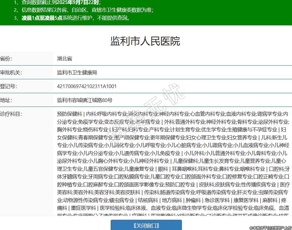 省份:湖北省审批机关:监利市卫生健康局登记号:42170069742102311A1001地址:监利市容城镇江城路80号诊疗科目:预防保健科 | 内科;呼吸内科专业;消化内科专业;神经内科专业;心血管内科专业;血液内科专业;肾病学专业;内分泌专业;免疫学专业;变态反应专业;老年病专业 | 外科;普通外科专业;神经外科专业;骨科专业;泌尿外科专业;胸外科专业;烧伤科专业 | 妇产科;妇科专业;产科专业;计划生育专业;优生学专业;生殖健康与不孕症专业 | 妇女保健科;青春期保健专业;围产期保健专业;更年期保健专业;妇女心理卫生专业;妇女营养专业 | 儿科;新生儿专业;小儿传染病专业;小儿消化专业;小儿呼吸专业;小儿心脏病专业;小儿肾病专业;小儿血液病专业;小儿神经病学专业;小儿内分泌专业;小儿遗传病专业;小儿免疫专业 | 小儿外科;小儿普通外科专业;小儿骨科专业;小儿泌尿外科专业;小儿胸心外科专业;小儿神经外科专业 | 儿童保健科;儿童生长发育专业;儿童营养专业;儿童心理卫生专业;儿童五官保健专业;儿童康复专业 | 眼科 | 耳鼻咽喉科;耳科专业;鼻科专业;咽喉科专业 | 口腔科;牙体牙髓病专业;牙周病专业;口腔粘膜病专业;儿童口腔专业;口腔颌面外科专业;口腔修复专业;口腔正畸专业;口腔种植专业;口腔麻醉专业;口腔颌面医学影像专业;预防口腔专业 | 皮肤科;皮肤病专业;性传播疾病专业 | 医疗美容科;美容外科;美容牙科;美容皮肤科 | 传染科;肠道传染病专业;呼吸道传染病专业;肝炎专业;虫媒传染病专业;动物源性传染病专业;蠕虫病专业 | 结核病科 | 地方病科 | 肿瘤科 | 急诊医学科 | 康复医学科 | 麻醉科 | 疼痛科 | 重症医学科 | 医学检验科;临床体液、血液专业;临床微生物学专业;临床化学检验专业;临床免疫、血清学专业;临床细胞分子遗传学专业 | 病理科 | 医学影像科;X线诊断专业;CT诊断专业;磁共振成像诊断专业;核医学专业;超声诊断专业;心电诊断专业;脑电及脑血流图诊断专业;神经肌肉电图专业;介入放射学专业;放射治疗专业 | 中医科;内科专业;骨伤科专业;肛肠科专业;老年病科专业;针灸科专业;推拿科专业;康复医学专业 | 中西医结合科******级别:二级法定代表人:邓志波主要负责人:邓志波执业许可证有效期:2017/06/14 -至- 2032/06/13 -