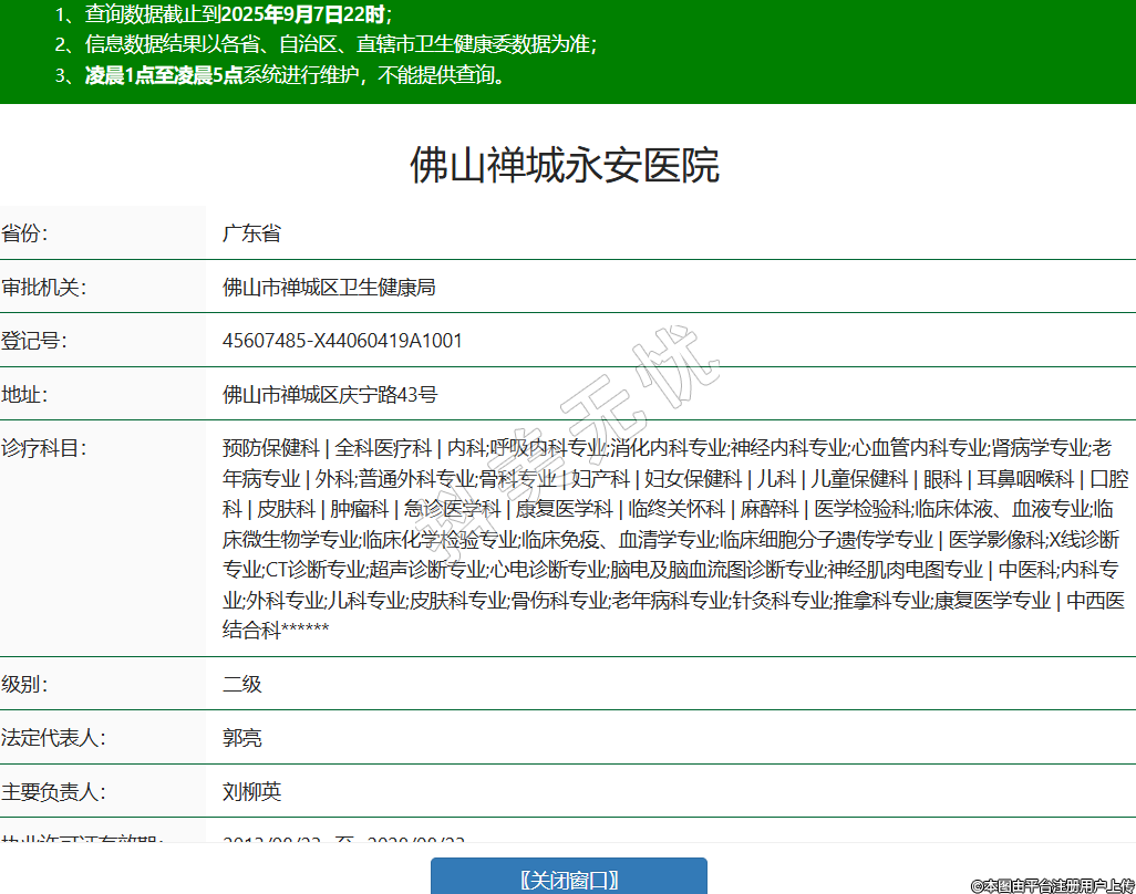 省份:广东省审批机关:佛山市禅城区卫生健康局登记号:45607485-X44060419A1001地址:佛山市禅城区庆宁路43号诊疗科目:预防保健科 | 全科医疗科 | 内科;呼吸内科专业;消化内科专业;神经内科专业;心血管内科专业;肾病学专业;老年病专业 | 外科;普通外科专业;骨科专业 | 妇产科 | 妇女保健科 | 儿科 | 儿童保健科 | 眼科 | 耳鼻咽喉科 | 口腔科 | 皮肤科 | 肿瘤科 | 急诊医学科 | 康复医学科 | 临终关怀科 | 麻醉科 | 医学检验科;临床体液、血液专业;临床微生物学专业;临床化学检验专业;临床免疫、血清学专业;临床细胞分子遗传学专业 | 医学影像科;X线诊断专业;CT诊断专业;超声诊断专业;心电诊断专业;脑电及脑血流图诊断专业;神经肌肉电图专业 | 中医科;内科专业;外科专业;儿科专业;皮肤科专业;骨伤科专业;老年病科专业;针灸科专业;推拿科专业;康复医学专业 | 中西医结合科******级别:二级法定代表人:郭亮主要负责人:刘柳英执业许可证有效期:2013/08/23 -至- 2028/08/23 -