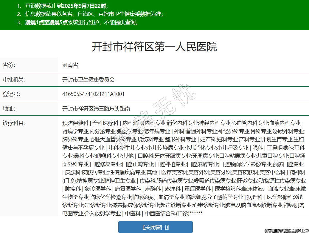 省份:河南省审批机关:开封市卫生健康委员会登记号:41650554741021211A1001地址:开封市祥符区纬三路东头路南诊疗科目:预防保健科 | 全科医疗科 | 内科;呼吸内科专业;消化内科专业;神经内科专业;心血管内科专业;血液内科专业;肾病学专业;内分泌专业;免疫学专业;老年病专业 | 外科;普通外科专业;神经外科专业;骨科专业;泌尿外科专业;胸外科专业;心脏大血管外科专业;烧伤科专业;整形外科专业 | 妇产科;妇科专业;产科专业;计划生育专业;生殖健康与不孕症专业 | 儿科;新生儿专业;小儿传染病专业;小儿消化专业;小儿呼吸专业 | 眼科 | 耳鼻咽喉科;耳科专业;鼻科专业;咽喉科专业;其他 | 口腔科;牙体牙髓病专业;牙周病专业;口腔粘膜病专业;儿童口腔专业;口腔颌面外科专业;口腔修复专业;口腔正畸专业;口腔种植专业;口腔麻醉专业;口腔颌面医学影像专业;预防口腔专业 | 皮肤科;皮肤病专业;性传播疾病专业;其他 | 医疗美容科;美容外科;美容牙科;美容皮肤科;美容中医科 | 精神科(门诊);精神病专业;精神卫生专业 | 传染科;肠道传染病专业;呼吸道传染病专业;肝炎专业;动物源性传染病专业 | 肿瘤科 | 急诊医学科 | 康复医学科 | 麻醉科 | 疼痛科 | 重症医学科 | 医学检验科;临床体液、血液专业;临床微生物学专业;临床化学检验专业;临床免疫、血清学专业;临床细胞分子遗传学专业 | 病理科 | 医学影像科;X线诊断专业;CT诊断专业;磁共振成像诊断专业;超声诊断专业;心电诊断专业;脑电及脑血流图诊断专业;神经肌肉电图专业;介入放射学专业 | 中医科 | 中西医结合科(门诊)******级别:三级法定代表人:杨长松主要负责人:***执业许可证有效期:2025/08/13 -至- 2038/10/09 -