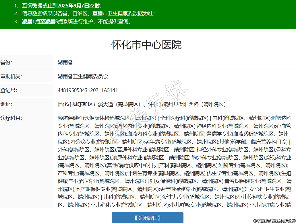 省份:湖南省审批机关:湖南省卫生健康委员会登记号:44819505343120211A5141地址:怀化市城东新区五溪大道(鹤城院区)、怀化市靖州县渠阳西路(靖州院区)诊疗科目:预防保健科(含健康体检鹤城院区、靖州院区) | 全科医疗科(鹤城院区) | 内科(鹤城院区、靖州院区);呼吸内科专业(鹤城院区、靖州院区);消化内科专业(鹤城院区、靖州院区);神经内科专业(鹤城院区、靖州院区);心血管内科专业(鹤城院区、靖州院区);血液内科专业(鹤城院区、靖州院区);肾病学专业(血液透析鹤城院区、靖州院区);内分泌专业(鹤城院区、靖州院区);老年病专业(鹤城院区、靖州院区);其他(药学部、临床营养科门诊) | 外科(鹤城院区、靖州院区);普通外科专业(鹤城院区、靖州院区);神经外科专业(鹤城院区、靖州院区);骨科专业(鹤城院区、靖州院区);泌尿外科专业(鹤城院区、靖州院区);胸外科专业(鹤城院区、靖州院区);烧伤科专业(鹤城院区、靖州院区);其他(消毒供应中心) | 妇产科(鹤城院区、靖州院区);妇科专业(鹤城院区、靖州院区);产科专业(鹤城院区、靖州院区);计划生育专业(鹤城院区、靖州院区);优生学专业(鹤城院区、靖州院区);生殖健康与不孕症专业(鹤城院区、靖州院区) | 妇女保健科(鹤城院区、靖州院区);青春期保健专业(鹤城院区、靖州院区);围产期保健专业(鹤城院区、靖州院区);更年期保健专业(鹤城院区、靖州院区);妇女心理卫生专业(鹤城院区、靖州院区) | 儿科(鹤城院区、靖州院区);新生儿专业(鹤城院区、靖州院区);小儿传染病专业(鹤城院区、靖州院区);小儿消化专业(鹤城院区、靖州院区);小儿呼吸专业(鹤城院区、靖州院区);小儿心脏病专业(靖州院区);小儿肾病专业(靖州院区);小儿血液病专业(靖州院区);小儿神经病学专业(靖州院区);小儿内分泌专业(靖州院区);小儿遗传病专业(靖州院区);小儿免疫专业(靖州院区) | 眼科(鹤城院区、靖州院区) | 耳鼻咽喉科(鹤城院区、靖州院区);耳科专业(鹤城院区、靖州院区);鼻科专业(鹤城院区、靖州院区);咽喉科专业(鹤城院区、靖州院区) | 口腔科(鹤城院区、靖州院区);牙体牙髓病专业(鹤城院区);牙周病专业(鹤城院区);口腔颌面外科专业(鹤城院区、靖州院区);口腔修复专业(鹤城院区、靖州院区);口腔正畸专业(鹤城院区、靖州院区);口腔颌面医学影像专业(鹤城院区);预防口腔专业(鹤城院区、靖州院区) | 皮肤科(鹤城院区、靖州院区);皮肤病专业(鹤城院区、靖州院区);性传播疾病专业(鹤城院区、靖州院区) | 医疗美容科(鹤城院区);美容外科(鹤城院区:一、二级项目);美容牙科(鹤城院区);美容皮肤科(鹤城院区) | 临床心理专业(门诊鹤城院区) | 传染科(鹤城院区、靖州院区);肠道传染病专业(靖州院区);呼吸道传染病专业(靖州院区);肝炎专业(靖州院区);虫媒传染病专业(靖州院区);动物源性传染病专业(靖州院区);蠕虫病专业(靖州院区) | 结核病科(靖州院区) | 肿瘤科(鹤城院区) | 急诊医学科(鹤城院区、靖州院区) | 康复医学科(鹤城院区、靖州院区) | 临终关怀科(靖州院区、鹤城院区) | 麻醉科(鹤城院区、靖州院区) | 疼痛科(鹤城院区) | 重症医学科(鹤城院区仅限ICU、靖州院区) | 医学检验科(鹤城院区、靖州院区);临床体液、血液专业(鹤城院区、靖州院区);临床微生物学专业(鹤城院区、靖州院区);临床化学检验专业(鹤城院区、靖州院区);临床免疫、血清学专业(鹤城院区、靖州院区);其他(输血科) | 病理科(鹤城院区、靖州院区) | 医学影像科(鹤城院区、靖州院区);X线诊断专业(鹤城院区、靖州院区);CT诊断专业(鹤城院区、靖州院区);磁共振成像诊断专业(鹤城院区、靖州院区);核医学专业(鹤城院区);超声诊断专业(鹤城院区、靖州院区);心电诊断专业(鹤城院区、靖州院区);脑电及脑血流图诊断专业(鹤城院区、靖州院区);神经肌肉电图专业(鹤城院区、靖州院区);介入放射学专业(鹤城院区、靖州院区);放射治疗专业(鹤城院区) | 中医科(靖州院区) | 中西医结合科(鹤城院区)******级别:三级法定代表人:刘军主要负责人:刘军执业许可证有效期:2020/09/29 -至- 2035/09/29 -