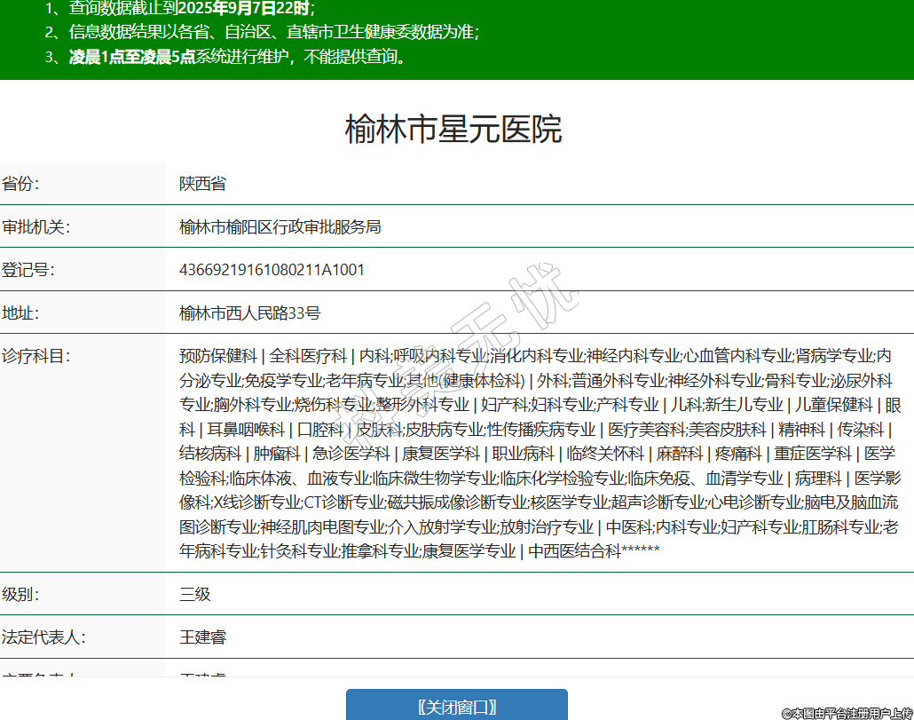 省份:陕西省审批机关:榆林市榆阳区行政审批服务局登记号:43669219161080211A1001地址:榆林市西人民路33号诊疗科目:预防保健科 | 全科医疗科 | 内科;呼吸内科专业;消化内科专业;神经内科专业;心血管内科专业;肾病学专业;内分泌专业;免疫学专业;老年病专业;其他(健康体检科) | 外科;普通外科专业;神经外科专业;骨科专业;泌尿外科专业;胸外科专业;烧伤科专业;整形外科专业 | 妇产科;妇科专业;产科专业 | 儿科;新生儿专业 | 儿童保健科 | 眼科 | 耳鼻咽喉科 | 口腔科 | 皮肤科;皮肤病专业;性传播疾病专业 | 医疗美容科;美容皮肤科 | 精神科 | 传染科 | 结核病科 | 肿瘤科 | 急诊医学科 | 康复医学科 | 职业病科 | 临终关怀科 | 麻醉科 | 疼痛科 | 重症医学科 | 医学检验科;临床体液、血液专业;临床微生物学专业;临床化学检验专业;临床免疫、血清学专业 | 病理科 | 医学影像科;X线诊断专业;CT诊断专业;磁共振成像诊断专业;核医学专业;超声诊断专业;心电诊断专业;脑电及脑血流图诊断专业;神经肌肉电图专业;介入放射学专业;放射治疗专业 | 中医科;内科专业;妇产科专业;肛肠科专业;老年病科专业;针灸科专业;推拿科专业;康复医学专业 | 中西医结合科******级别:三级法定代表人:王建睿主要负责人:王建睿执业许可证有效期:2021/10/21 -至- 2026/10/20 -