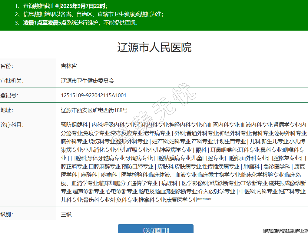 省份:吉林省审批机关:辽源市卫生健康委员会登记号:12515109-922042115A1001地址:辽源市西安区矿电西街188号诊疗科目:预防保健科 | 内科;呼吸内科专业;消化内科专业;神经内科专业;心血管内科专业;血液内科专业;肾病学专业;内分泌专业;免疫学专业;变态反应专业;老年病专业 | 外科;普通外科专业;神经外科专业;骨科专业;泌尿外科专业;胸外科专业;烧伤科专业;整形外科专业 | 妇产科;妇科专业;产科专业;计划生育专业 | 儿科;新生儿专业;小儿传染病专业;小儿消化专业;小儿呼吸专业;小儿神经病学专业 | 眼科 | 耳鼻咽喉科;耳科专业;鼻科专业;咽喉科专业 | 口腔科;牙体牙髓病专业;牙周病专业;口腔粘膜病专业;儿童口腔专业;口腔颌面外科专业;口腔修复专业;口腔正畸专业;口腔麻醉专业;预防口腔专业 | 皮肤科;皮肤病专业;性传播疾病专业 | 肿瘤科 | 急诊医学科 | 康复医学科 | 麻醉科 | 疼痛科 | 医学检验科;临床体液、血液专业;临床微生物学专业;临床化学检验专业;临床免疫、血清学专业;临床细胞分子遗传学专业 | 病理科 | 医学影像科;X线诊断专业;CT诊断专业;磁共振成像诊断专业;超声诊断专业;心电诊断专业;脑电及脑血流图诊断专业;介入放射学专业 | 中医科;内科专业;妇产科专业;儿科专业;骨伤科专业;针灸科专业;推拿科专业;康复医学专业******级别:三级法定代表人:张学民主要负责人:执业许可证有效期:2018/08/27 -至- 2033/08/27 -